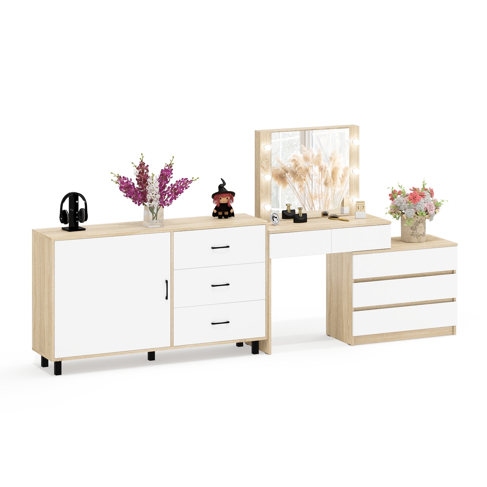 Стол-трансформер косметический с подсветкой 110 и комод-тумба три ящика 122-1504 — современный комплект мебели для спальни. Практичный комод и удобный угловой туалетный столик с зеркалом создают комфортное пространство для хранения и ухода.