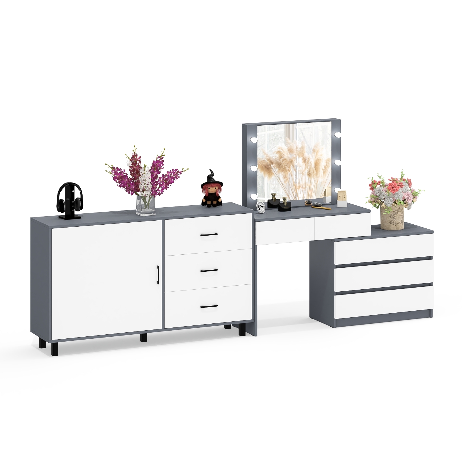 Стол-трансформер косметический с подсветкой 110 и комод-тумба три ящика 122-1504 — современный комплект мебели для спальни. Практичный комод и удобный угловой туалетный столик с зеркалом создают комфортное пространство для хранения и ухода.