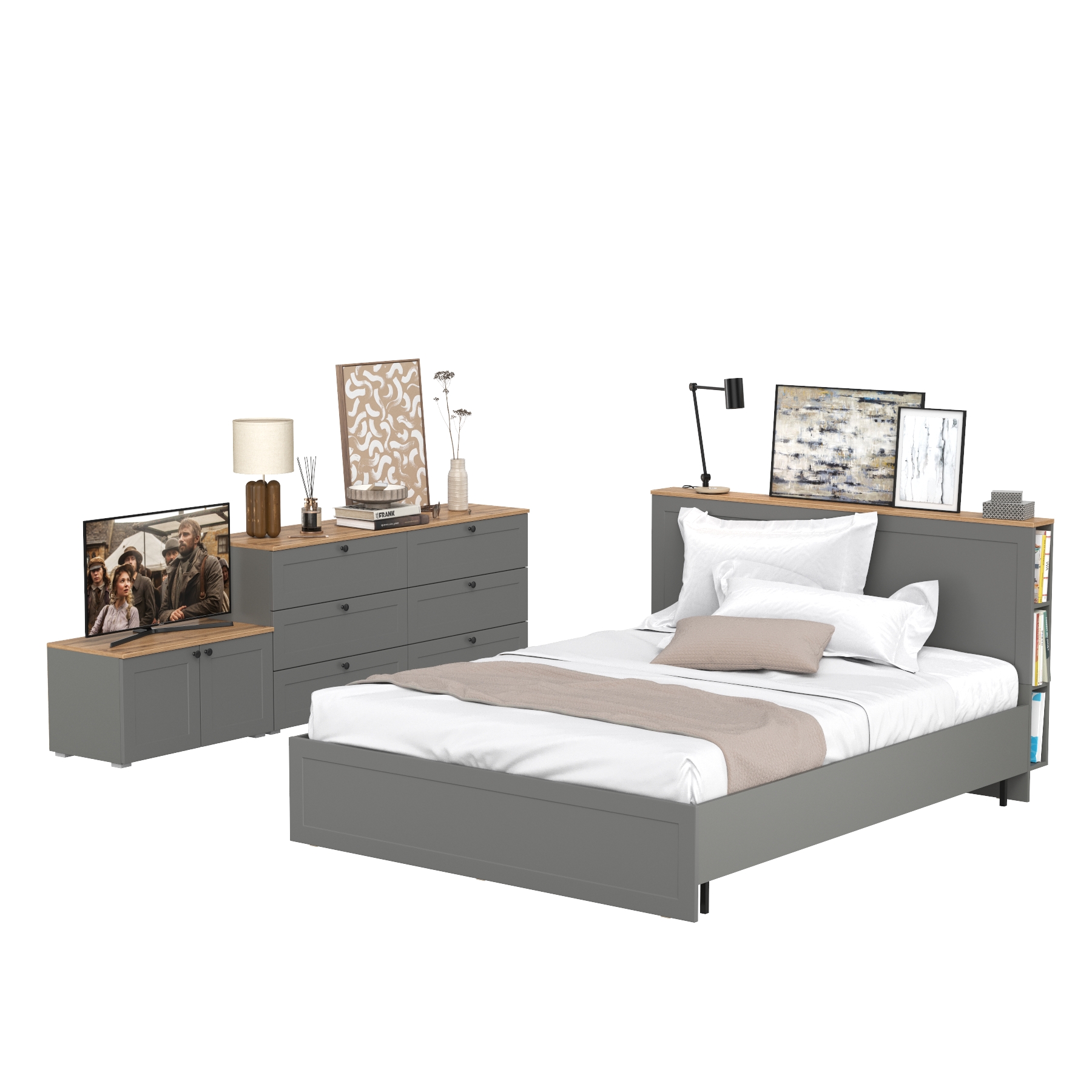 Отзывы о Столплит Кровать Остин с ортопедическим основанием с комодом 6-ть ящиков и тумбой с дверками Крафт золотой/Серый