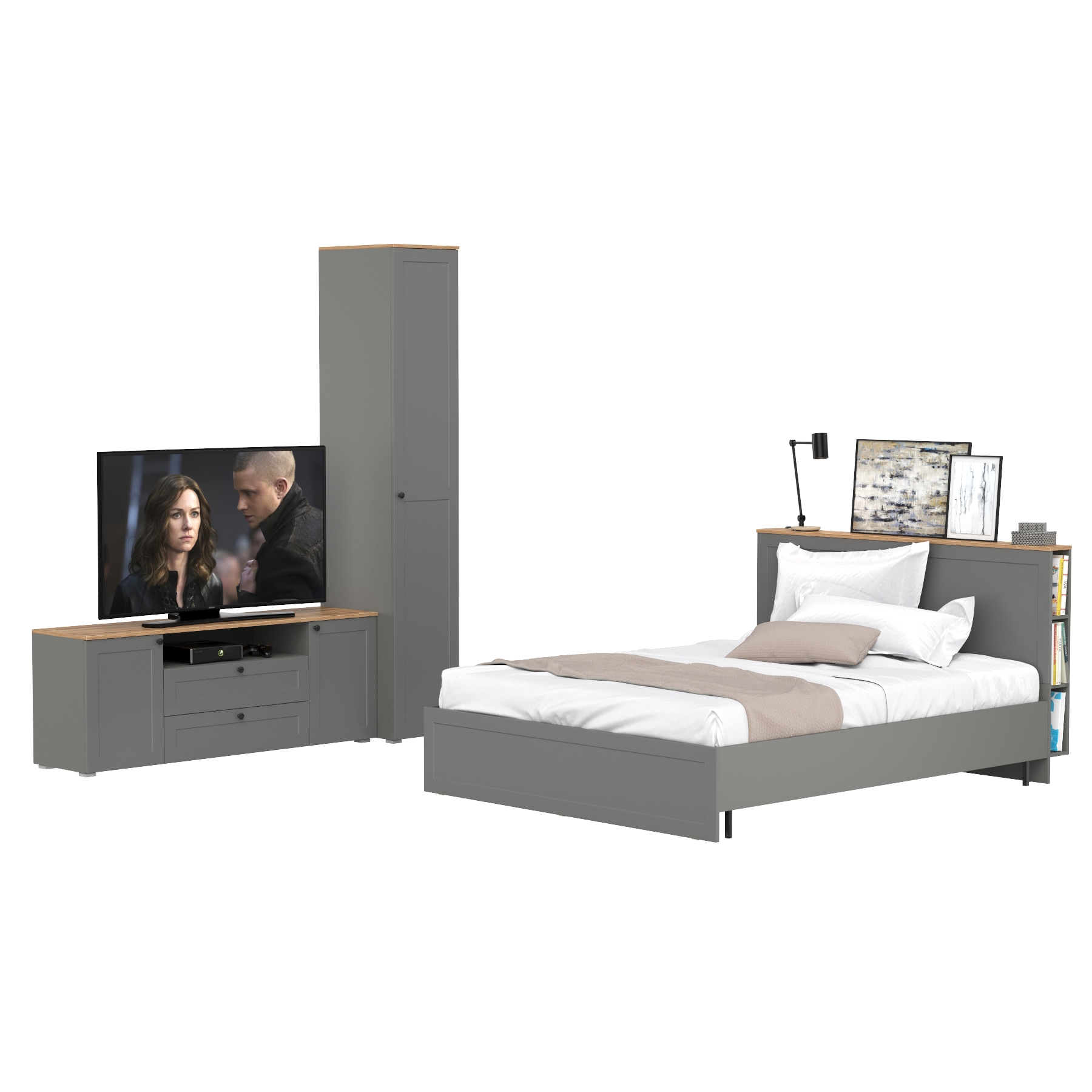 Отзывы о Столплит Кровать Остин с ортопедическим основанием для матраса 1600х2000 с тумбой для аппаратуры и шкафом-пеналом Крафт золотой/Серый