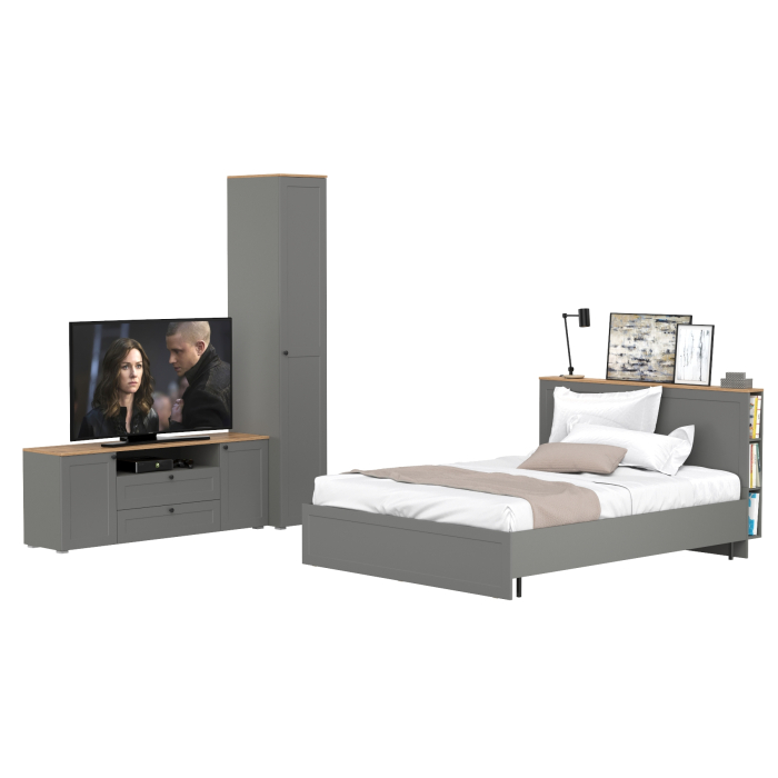 Кровать Остин с ортопедическим основанием для матраса 1600х2000 с тумбой для аппаратуры и шкафом-пеналом. Комплектация состоит из двуспальной кровати Остин 11.53 с ортопедическим основанием, глубокого пенала Остин 13.225 и тумбы под ТВ Остин 16.47.