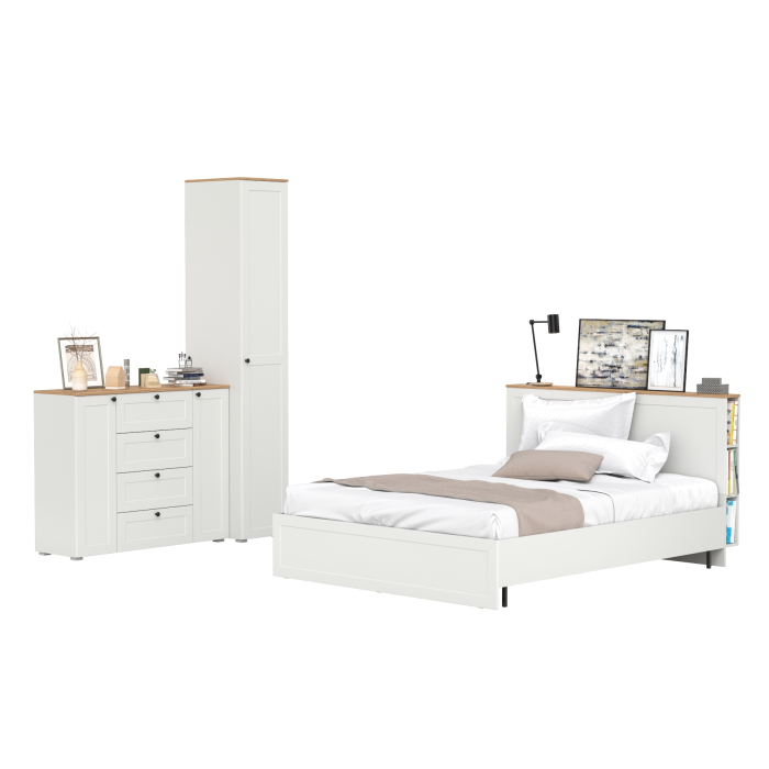 Остин двухспальная кровать с ортопедическим основанием и платяной шкаф-пенал с тумбой-комодом. Комплектация состоит из двуспальной кровати Остин 11.53 с ортопедическим основанием, глубокого пенала Остин 13.225 и комода Остин 16.221.