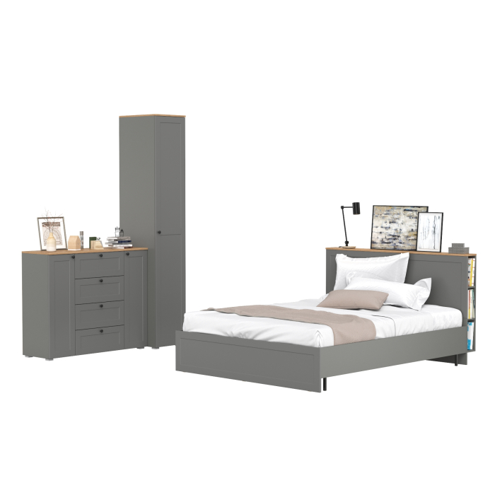 Отзывы о Столплит Двухспальная кровать с ортопедическим основанием Остин и платяной шкаф-пенал с тумбой-комодом Крафт золотой/Серый