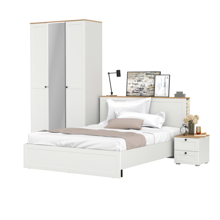 Остин гарнитур спальный из шкафа с зеркалом с кроватью 11.53 с ортопедом и прикроватной тумбочки. Комплектация состоит из двуспальной кровати Остин 11.53 с ортопедическим основанием, тумбы прикроватной Остин 16.152 и шкафа с зеркалом Остин 13.336.03.