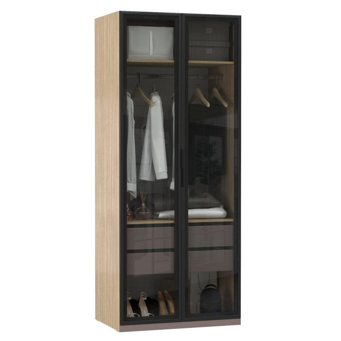 За двумя стеклянными дверцами находится антресольная полка, под которой расположено отделение с горизонтальной штангой для одежды на плечиках и полка снизу для складирования вещей. Ниже находится отдельное отделение с двумя выдвижными ящиками на шариковых направляющих, под которыми расположена дополнительная ниша для хранения различных предметов. Такое внутреннее наполнение позволяет рационально организовать пространство и удобно размещать как одежду, так и аксессуары или декоративные элементы.