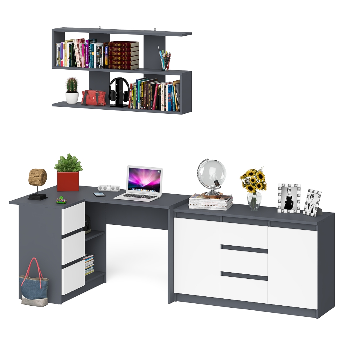 Выполнено в 5 цветах: белый, графит, графит/белый, дуб сонома и дуб сонома/белый.