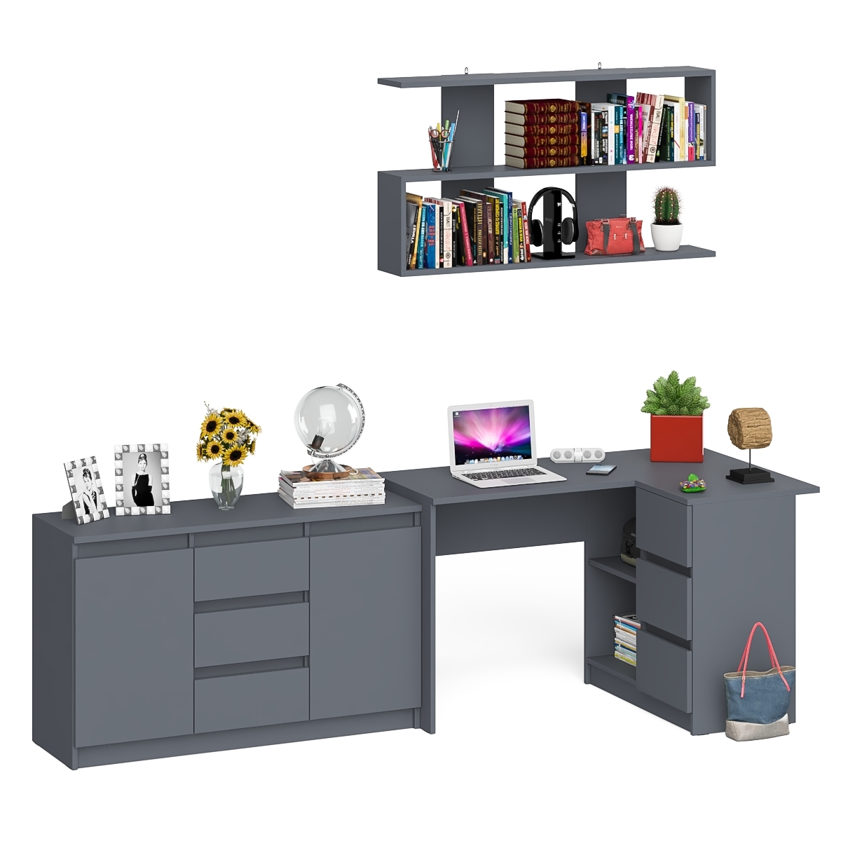 Комплектация включает угловой компьютерный стол Мори МС-16 правый, комод-тумбу три ящика и две дверки Мори МК1200.3 и навесную полку Плк-1200. Отсутствие ручек главное преимущество данной модели. Роль ручек выполняют сами фасады.