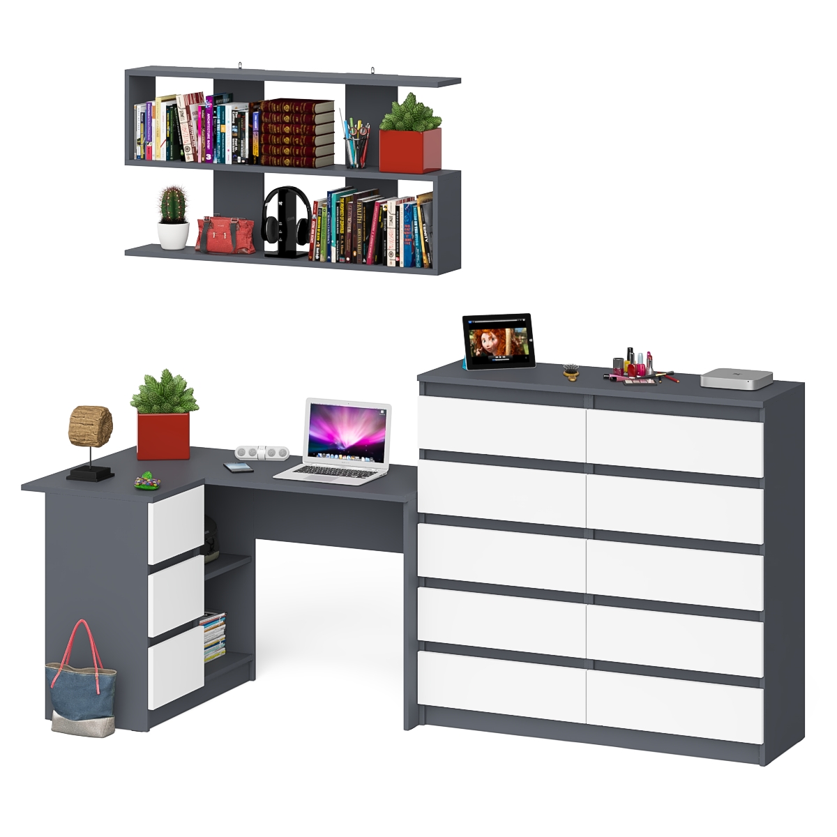 Выполнено в 5 цветах: белый, графит, графит/белый, дуб сонома и дуб сонома/белый.
