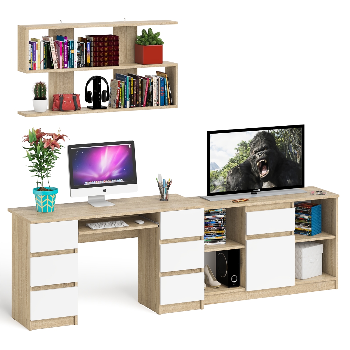 Отзывы о Столплит Стол письменный двухтумбовый Мори МС-2 с навесной открытой полкой и тумбой под ТВ Дуб Сонома, Белый
