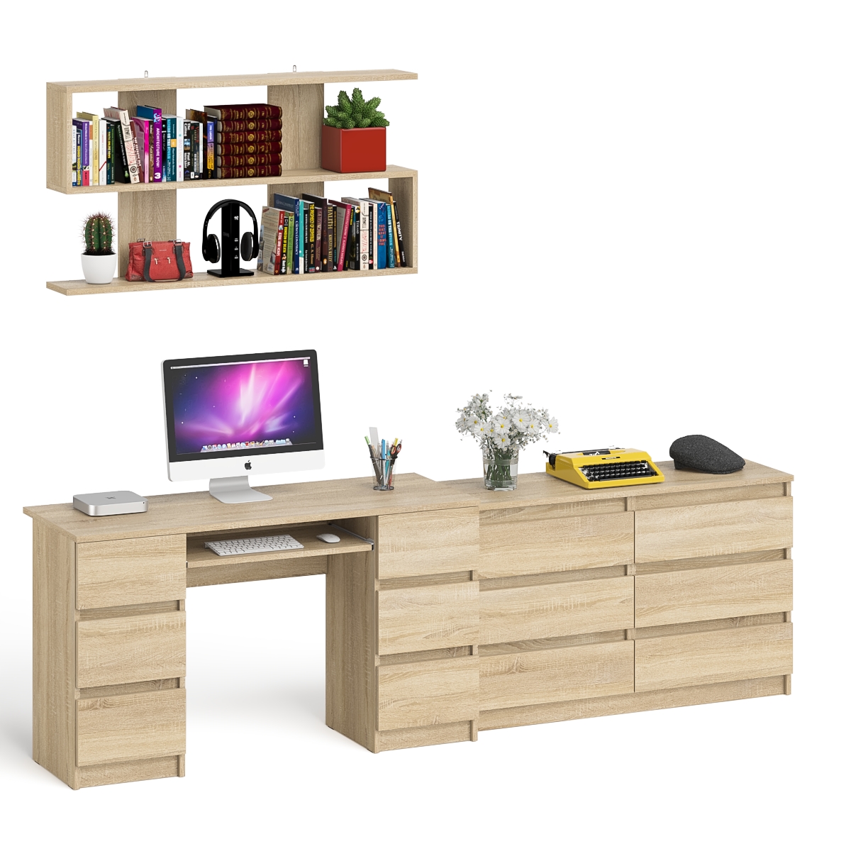 Отзывы о Столплит Широкий комод Мори на шесть ящиков с двутумбовым столом МС-2 и открытой полкой Дуб сонома