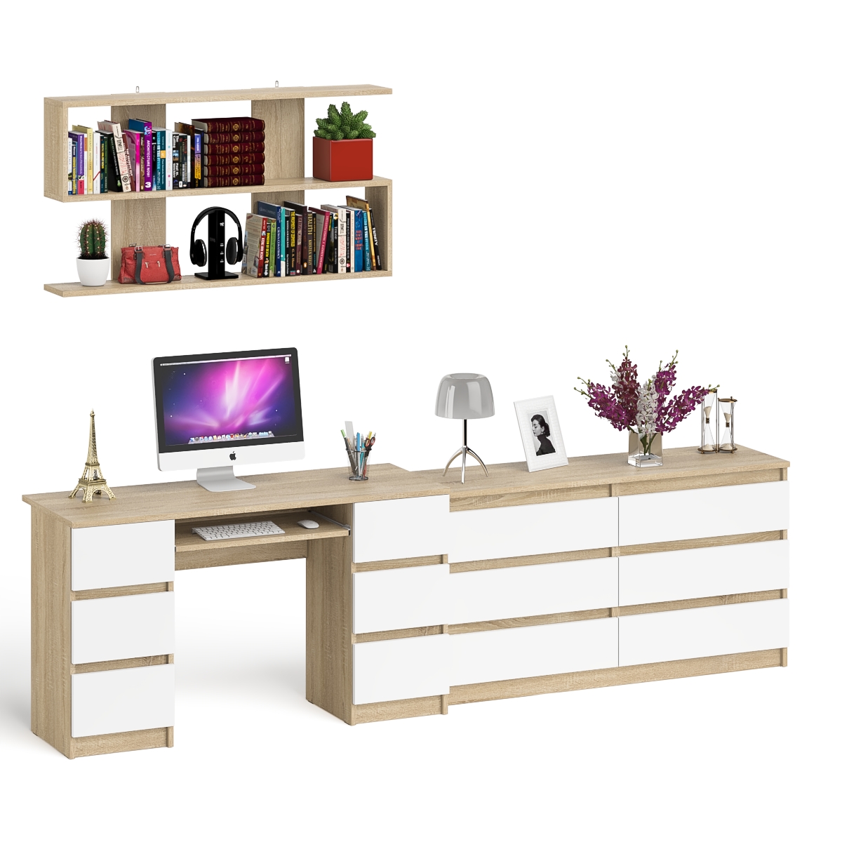 Отзывы о Столплит Стол компьютерный ящики слева и справа Мори МС-2 с комодом и полкой навесной Дуб Сонома, Белый