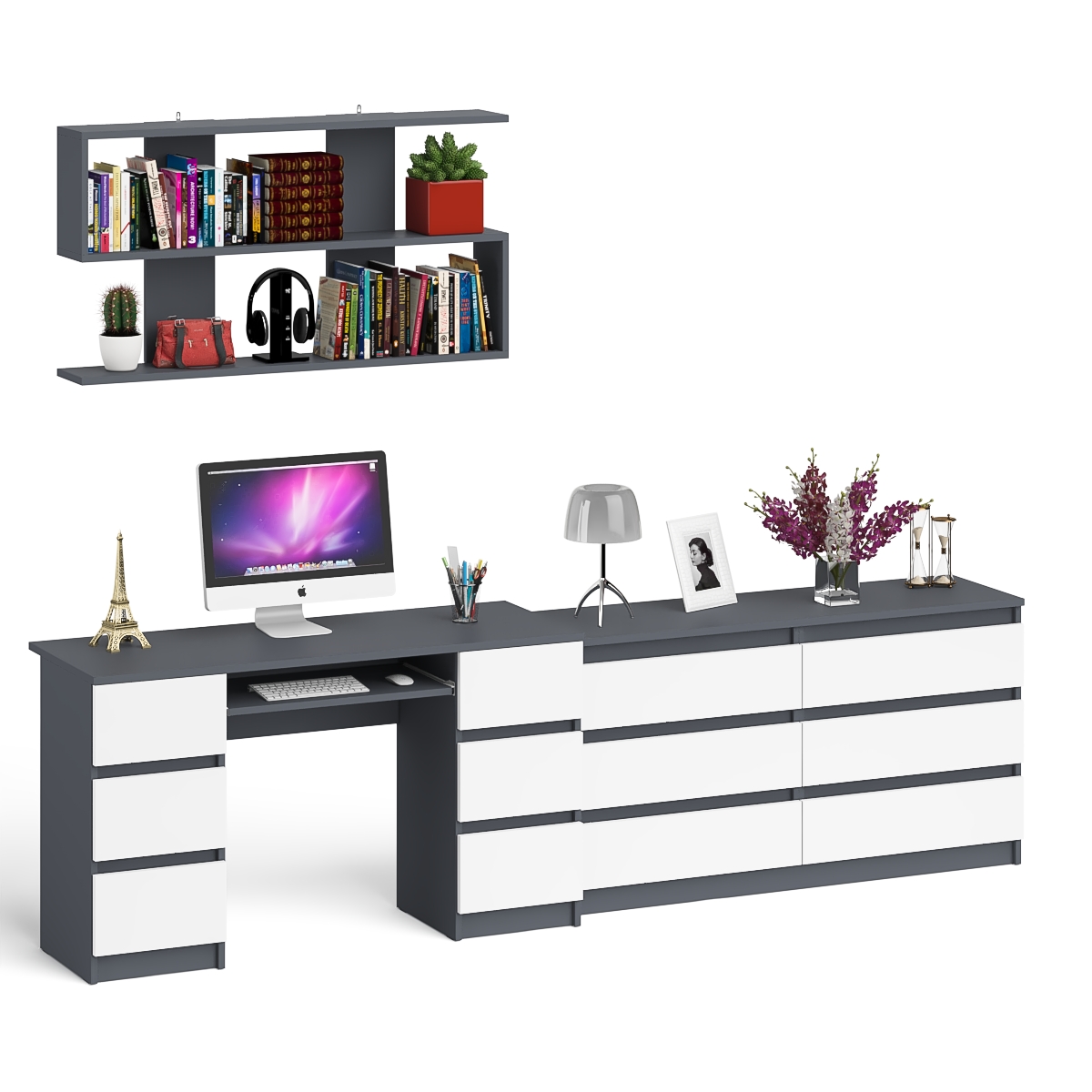 Стол компьютерный ящики слева и справа Мори МС-2 с комодом МК1380.6 и полкой навесной - минималистичный дизайн и доступная цена позволяет наслаждаться качественной и современной мебелью без значительных финансовых затрат! Комплектация включает компьютерный стол с двумя тумбами Мори МС-2, комод на шесть ящиков Мори МК1380.6 и навесную полку Плк-1200. Отсутствие ручек главное преимущество данной модели. Роль ручек выполняют сами фасады.