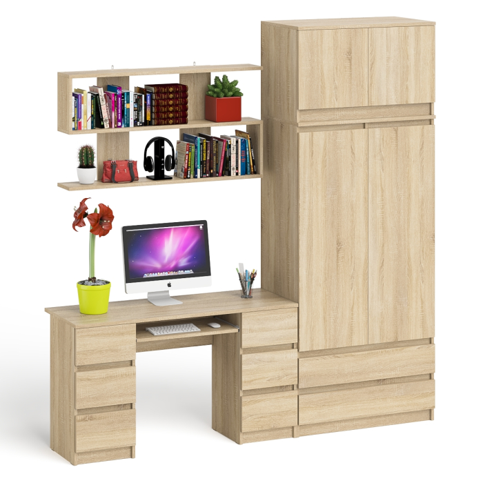 Шкаф-комод с антресолью Мори МШ900.1 со столом для работы и учёбы МС-2 и книжной полкой 1200 - минималистичный дизайн и доступная цена позволяет наслаждаться качественной и современной мебелью без значительных финансовых затрат! Комплектация включает компьютерный стол с двумя тумбами Мори МС-2, шкаф-комод два ящика и две дверки Мори МШ900.1 с антресолью Мори МА900.1 и навесную полку Плк-1200. Отсутствие ручек главное преимущество данной модели. Роль ручек выполняют сами фасады.