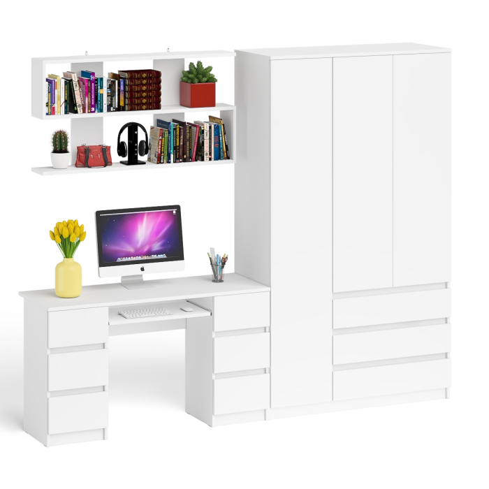 Шкаф-комод трёхдверный Мори МШ1200.1 с письменным столом МС-2 и открытой книжной полкой - минималистичный дизайн и доступная цена позволяет наслаждаться качественной и современной мебелью без значительных финансовых затрат! Комплектация включает компьютерный стол с двумя тумбами Мори МС-2, широкий шкаф-комод Мори МШ1200.1 и навесную полку Плк-1200. Отсутствие ручек главное преимущество данной модели. Роль ручек выполняют сами фасады.