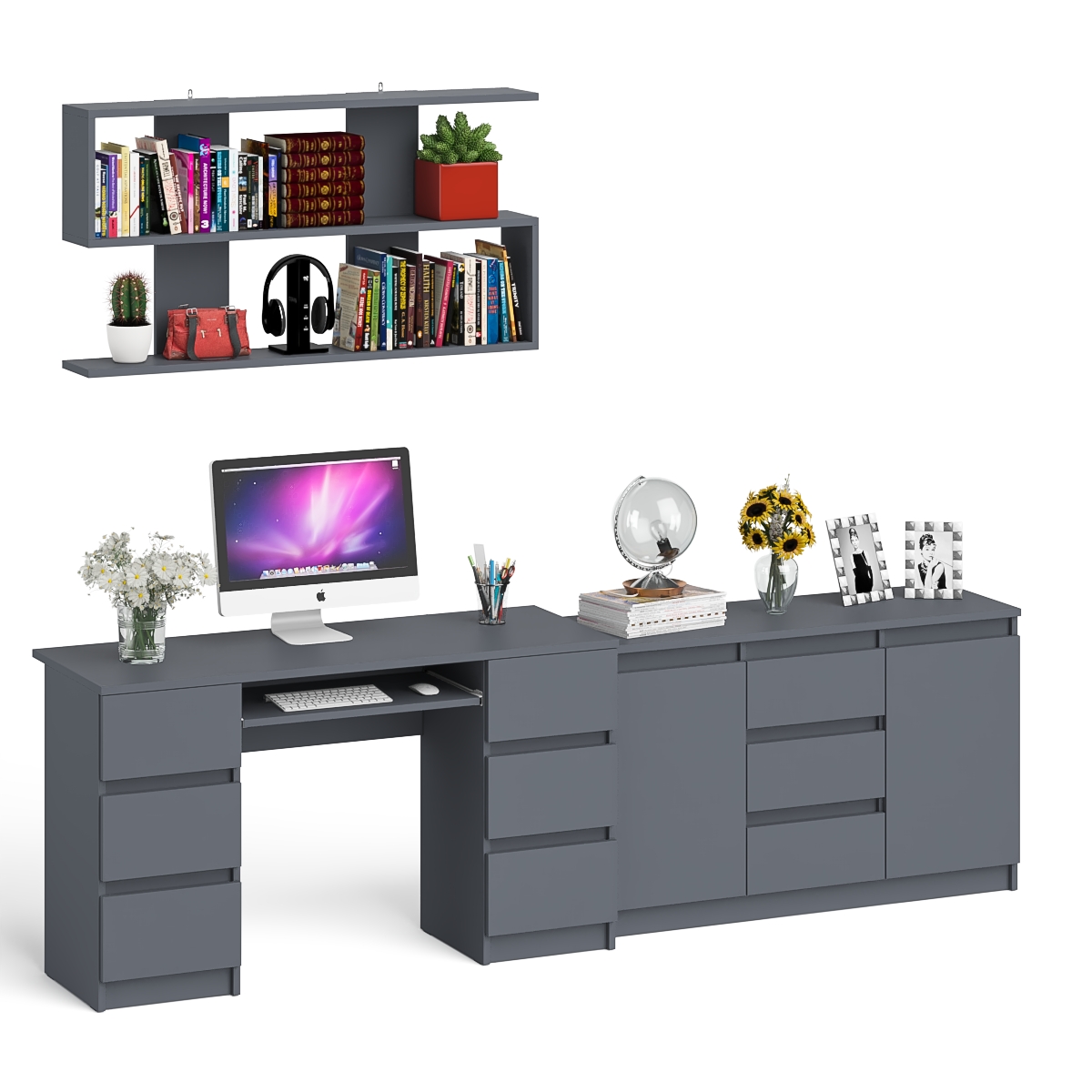 Двухтумбовый стол компьютерный с ящиками МС-2 с тумбой-комодом МК1200.3 и полкой 1200 Мори - минималистичный дизайн и доступная цена позволяет наслаждаться качественной и современной мебелью без значительных финансовых затрат! Комплектация включает компьютерный стол с двумя тумбами Мори МС-2, комод-тумбу три ящика и две дверки Мори МК1200.3 и навесную полку Плк-1200. Отсутствие ручек главное преимущество данной модели. Роль ручек выполняют сами фасады.