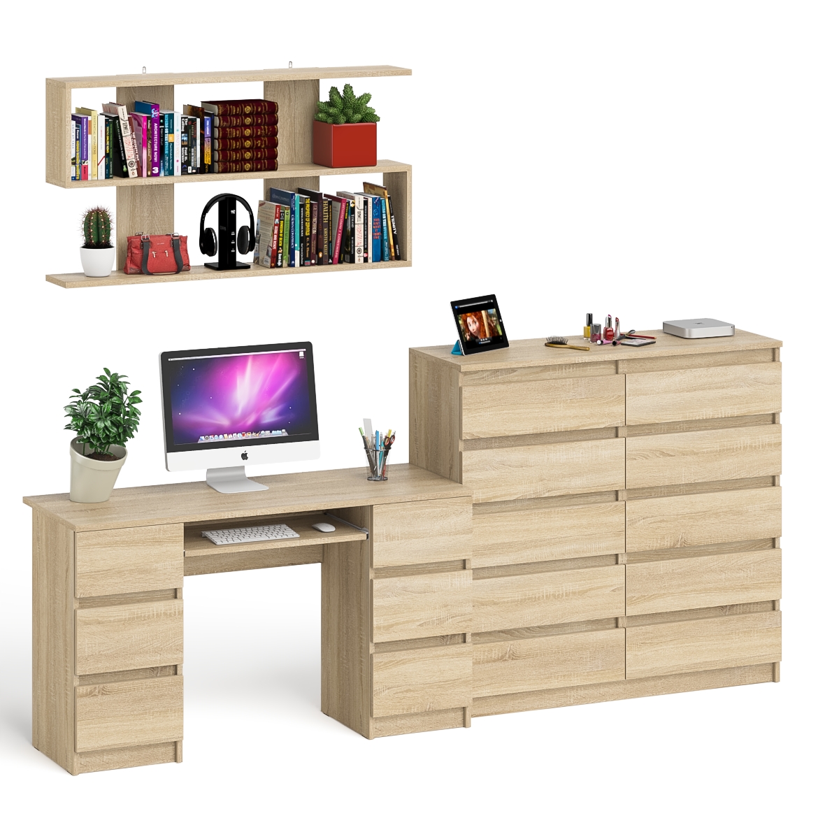 Комод Мори на десять ящиков МК1200.10 со столом компьютерно-письменным МС-2 и полкой сверху 1200 - минималистичный дизайн и доступная цена позволяет наслаждаться качественной и современной мебелью без значительных финансовых затрат! Комплектация включает компьютерный стол с двумя тумбами Мори МС-2, комод высокий на десять выдвижных ящиков Мори МК1200.10 и навесную полку Плк-1200. Отсутствие ручек главное преимущество данной модели. Роль ручек выполняют сами фасады.