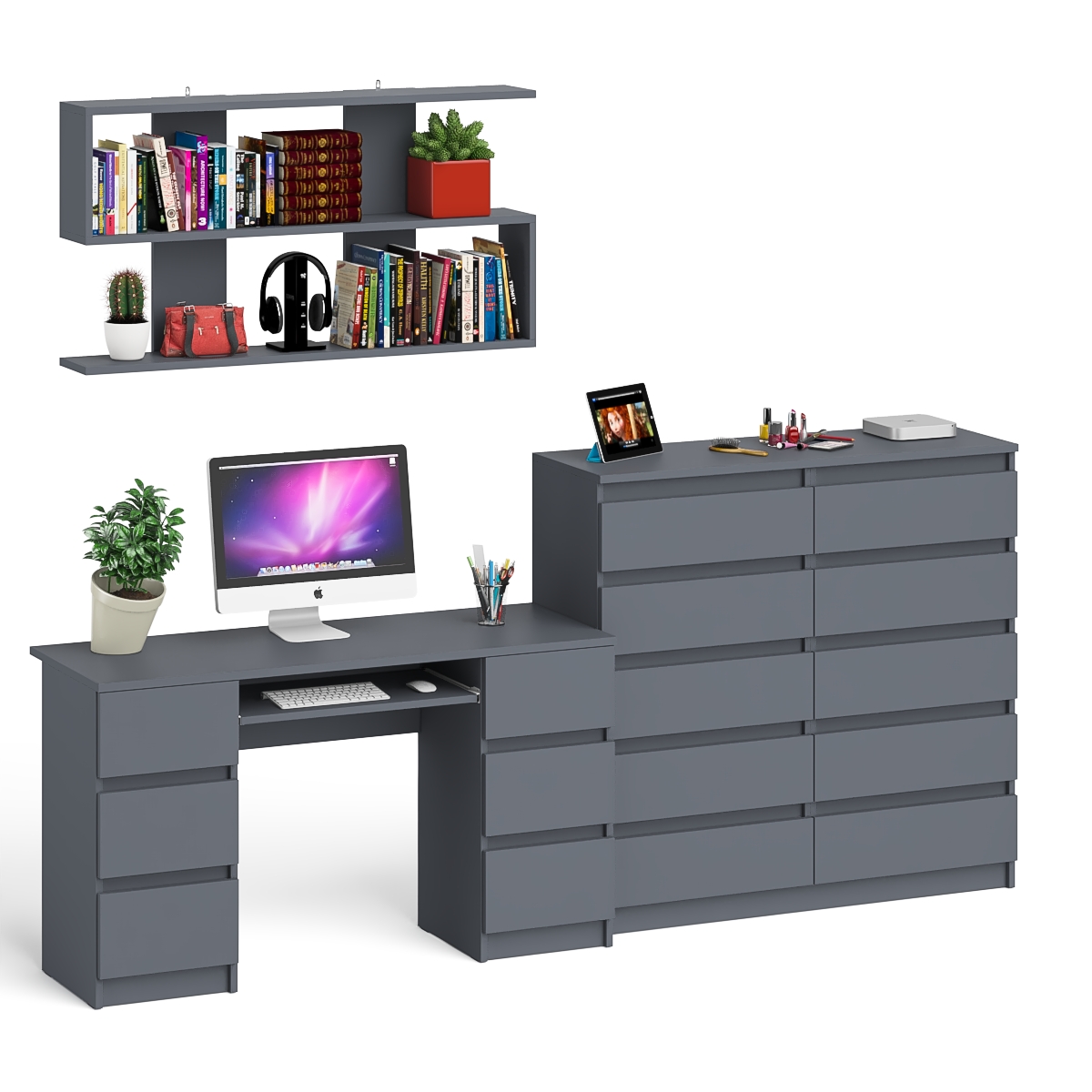 Комод Мори на десять ящиков МК1200.10 со столом компьютерно-письменным МС-2 и полкой сверху 1200 - минималистичный дизайн и доступная цена позволяет наслаждаться качественной и современной мебелью без значительных финансовых затрат! Комплектация включает компьютерный стол с двумя тумбами Мори МС-2, комод высокий на десять выдвижных ящиков Мори МК1200.10 и навесную полку Плк-1200. Отсутствие ручек главное преимущество данной модели. Роль ручек выполняют сами фасады.