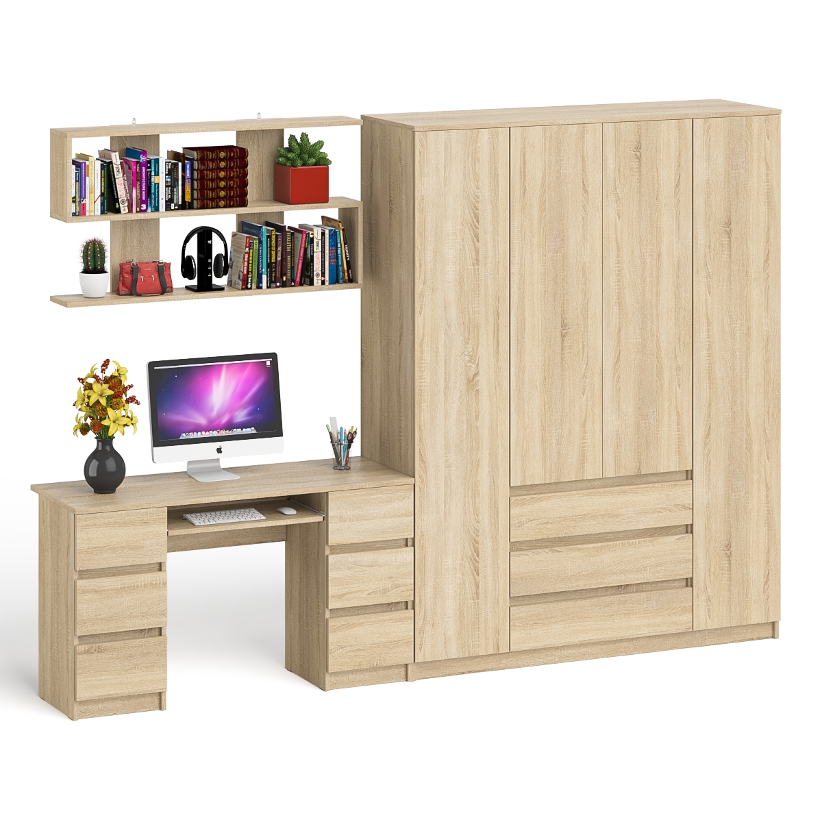 Большой 4-х дверный шкаф-комод Мори МШ1600.1 и стол компьютерный МС-2 с верхней навесной полкой Мори - минималистичный дизайн и доступная цена позволяет наслаждаться качественной и современной мебелью без значительных финансовых затрат! Комплектация включает компьютерный стол с двумя тумбами Мори МС-2, шкаф-комод с тремя ящиками и четырьмя дверками Мори МШ1600.1 и навесную полку Плк-1200. Отсутствие ручек главное преимущество данной модели. Роль ручек выполняют сами фасады.