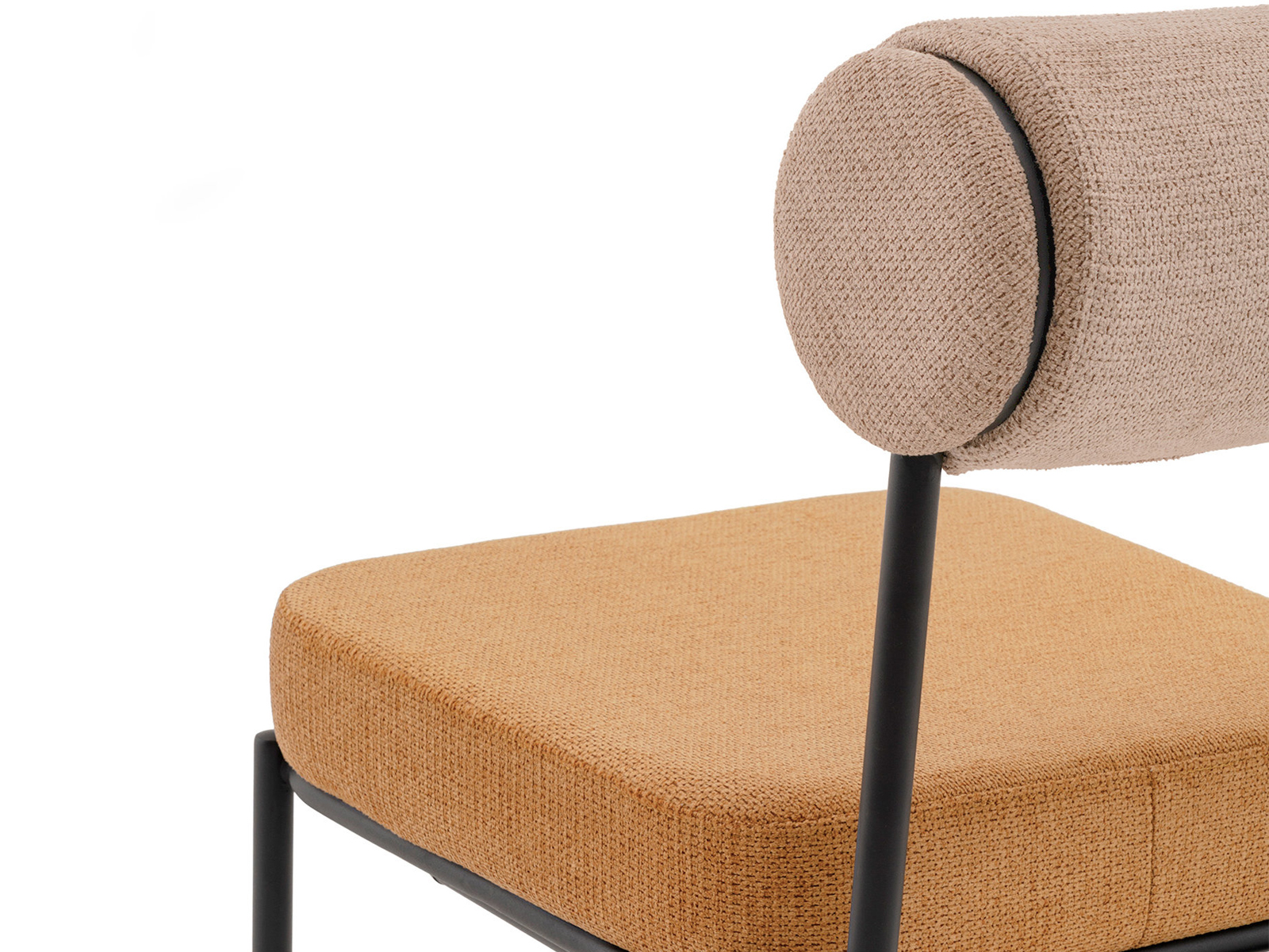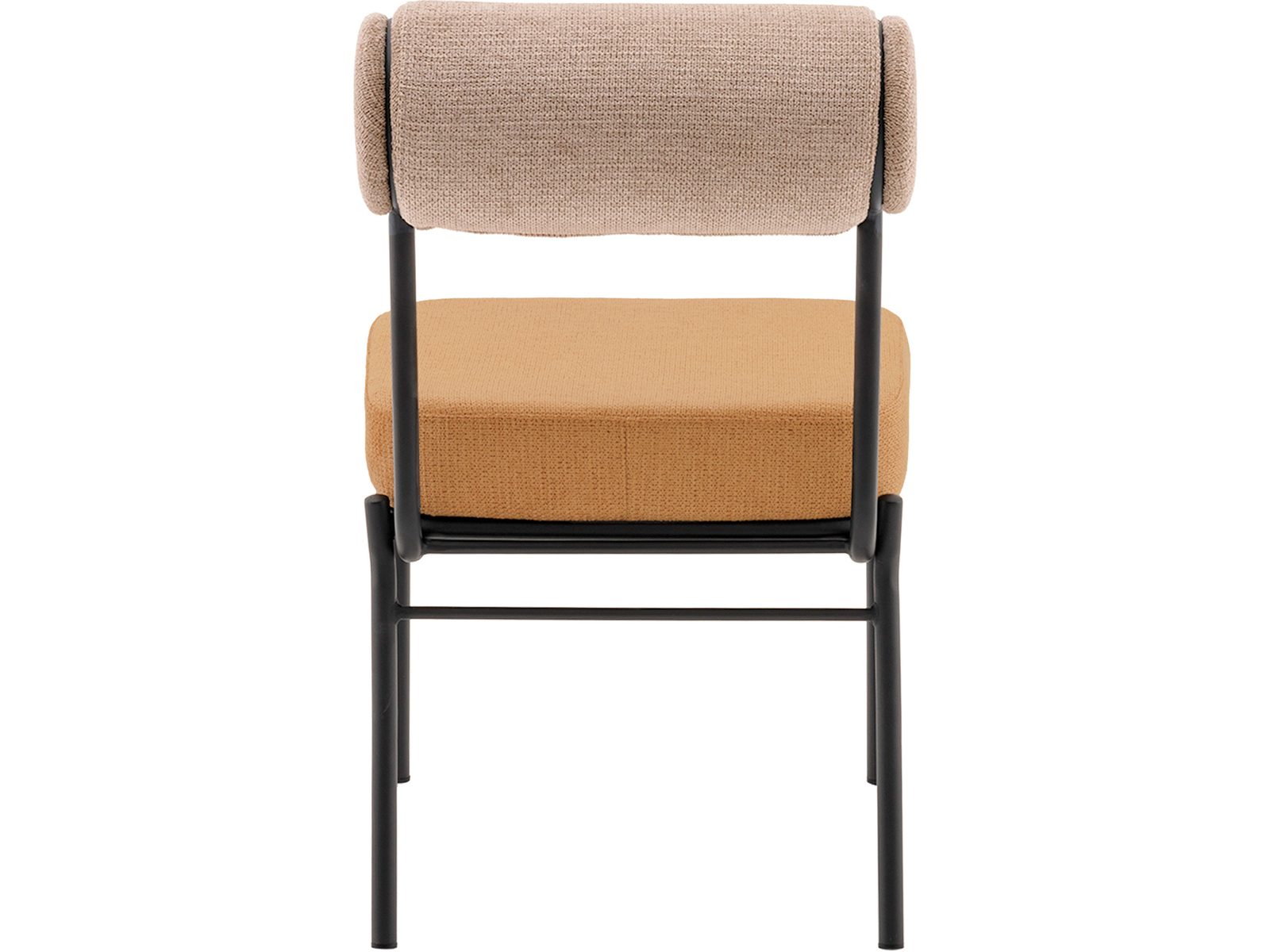 Стул выполнен из приятного на ощупь шенилла в теплых оттенках: сиденье – насыщенного терракотового цвета, а спинка – в бежевом тоне. Черный металлический каркас обеспечивает прочность и долговечность, создавая гармоничный контраст с мягкой текстильной обивкой. Особенность модели – цилиндрическая мягкая спинка, придающая стулу оригинальность и обеспечивающая удобную поддержку спины. Объемное сиденье с плотным наполнением делает посадку комфортной даже при длительном использовании. Металлический каркас гарантирует устойчивость конструкции, выдерживая нагрузку до 150 кг.