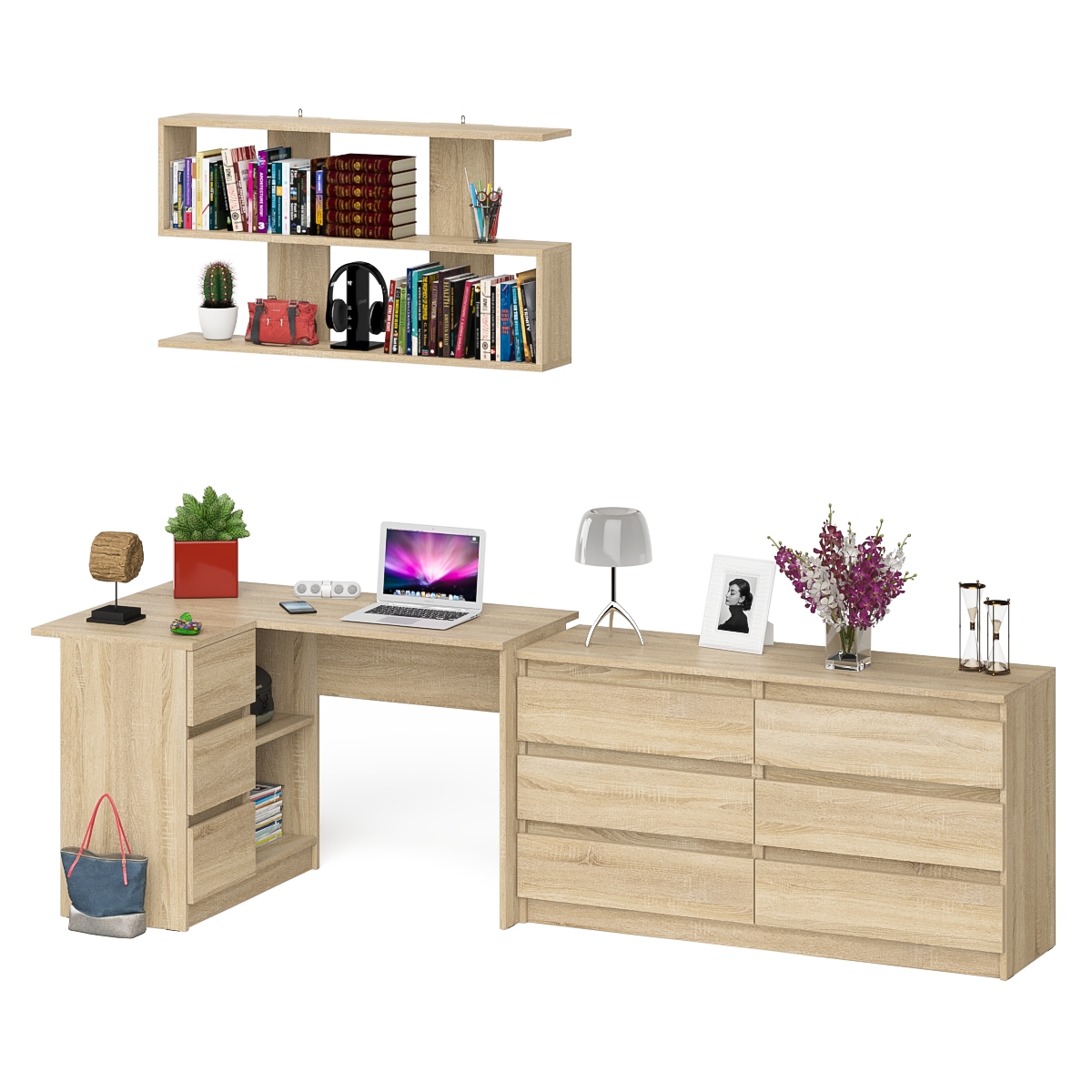 Стол угловой компьютерный Мори МС-16 левый с навесной книжной полкой и комодом МК1380.6 - минималистичный дизайн и доступная цена позволяет наслаждаться качественной и современной мебелью без значительных финансовых затрат! Комплектация включает угловой компьютерный стол Мори МС-16 левый, комод на шесть ящиков Мори МК1380.6 и навесную полку Плк-1200. Продуманная конструкция позволяет убрать лишние предметы, тем самым сохраняя единый стиль оформления помещения.