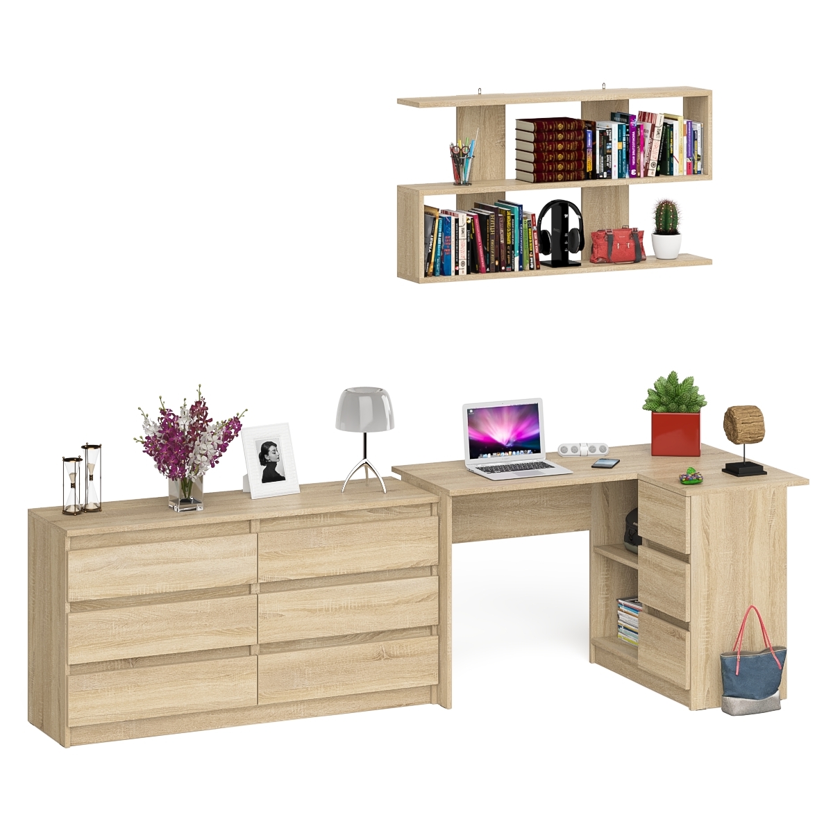 Отзывы о Столплит Комод широкий 6-ть ящиков Мори МК1380.6 с угловым компьютерным столом МС-16 правым и открытой книжной полкой Дуб сонома