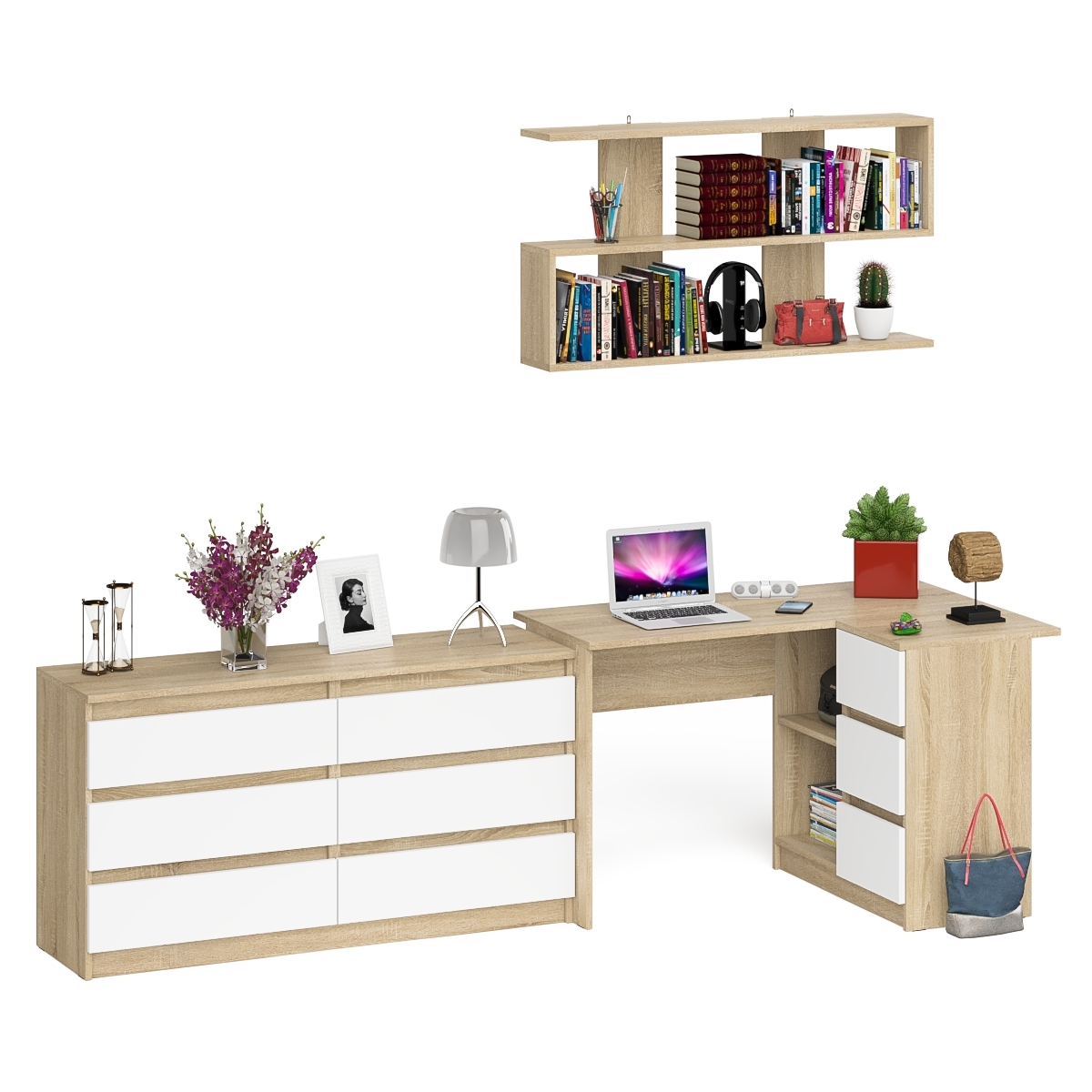 Отзывы о Столплит Комод широкий 6-ть ящиков Мори МК1380.6 с угловым компьютерным столом МС-16 правым и открытой книжной полкой Дуб Сонома, Белый