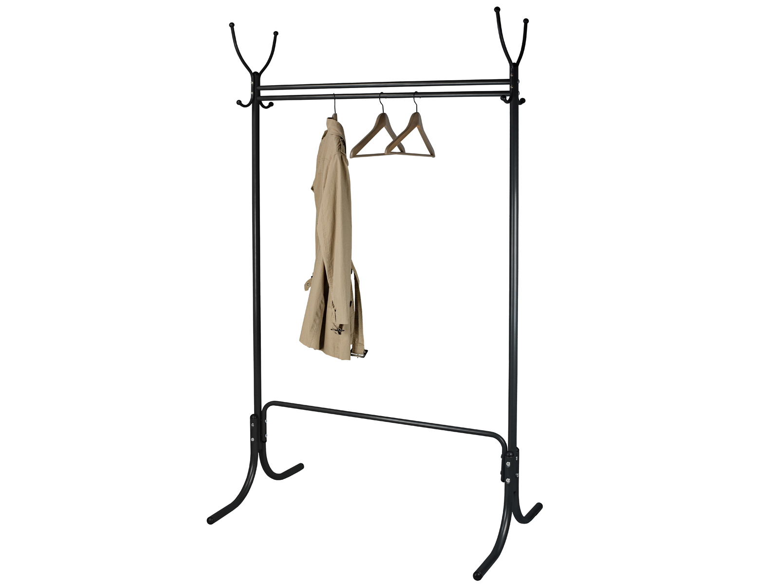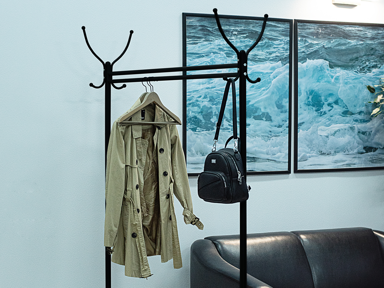 Вешалка рассчитана максимально на 12 посетителей: 4 крючка для одежды, столько же для головных уборов.