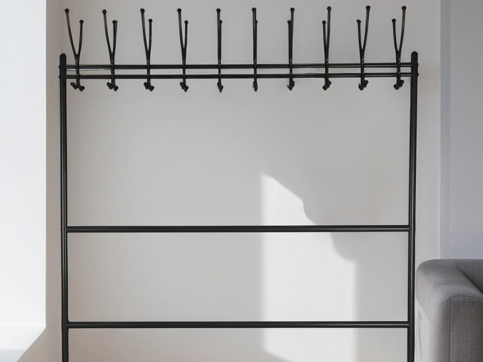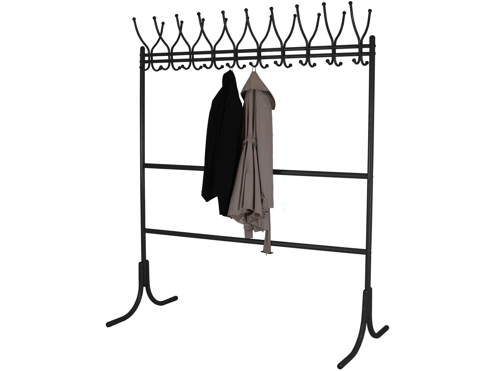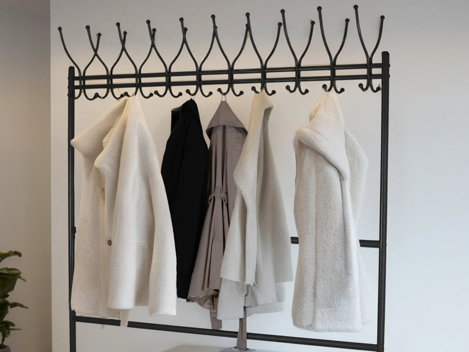 Вешалка рассчитана максимально на 20 посетителей: 20 крючков для одежды, столько же для головных уборов