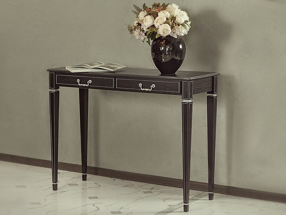 Классический консольный стол для оформления интерьера гостиной, прихожей, спальни. Конусообразные ножки с лаконичной гравировкой выполнены из массива бука. Все гравировки покрыты патиной, что еще больше подчеркивает их рисунок. Поверхность консоли шпонирована натуральным дубом, два выдвижных ящика. Надежная классическая конструкция, компактная упаковка, выверенные габаритные размеры. Предметы интерьера серии Васко: консоль, журнальный стол, зеркало, банкетка, костюмная вешалка - отлично дополняют друг друга создавая интерьер в стиле неоклассика.