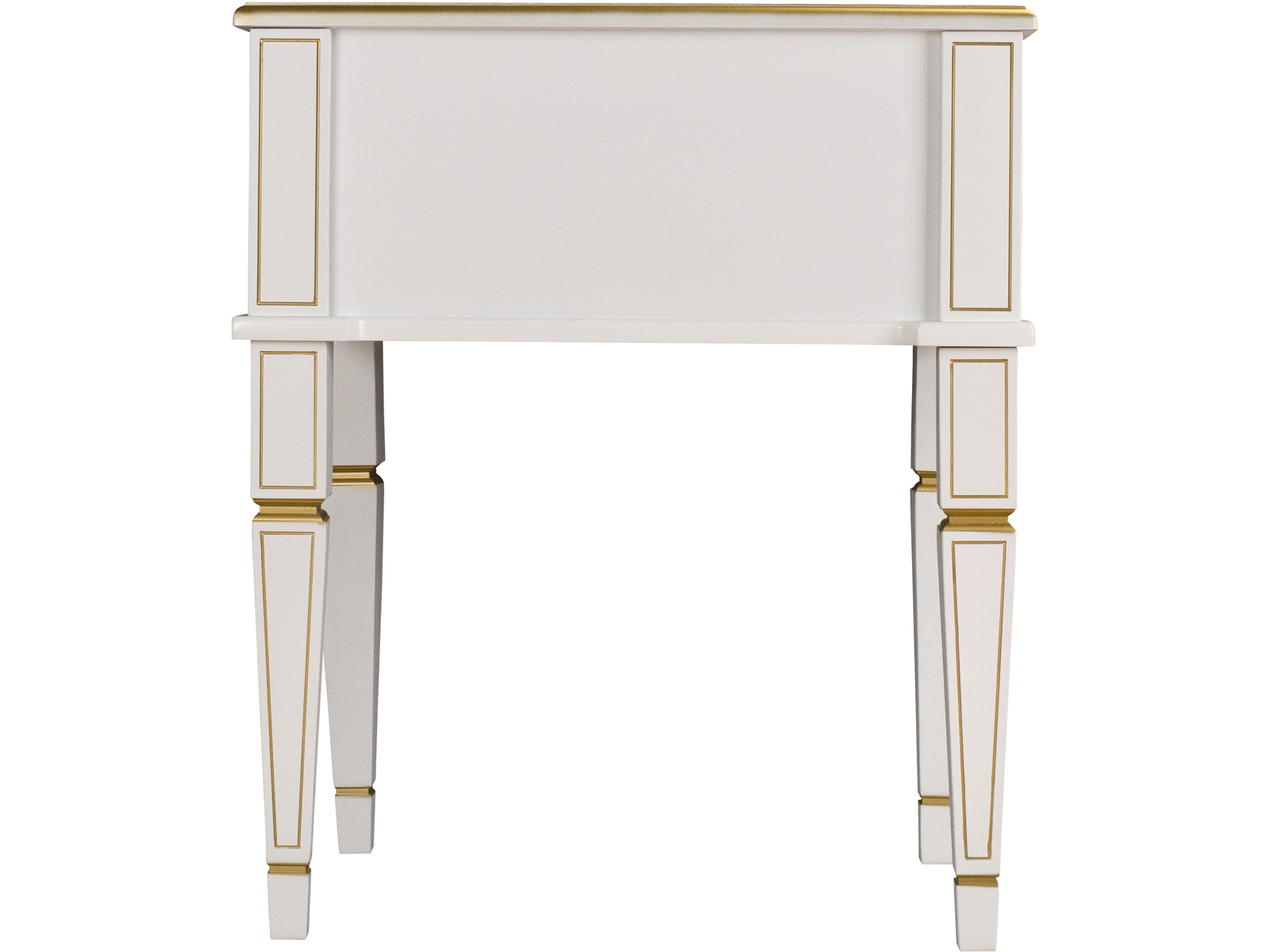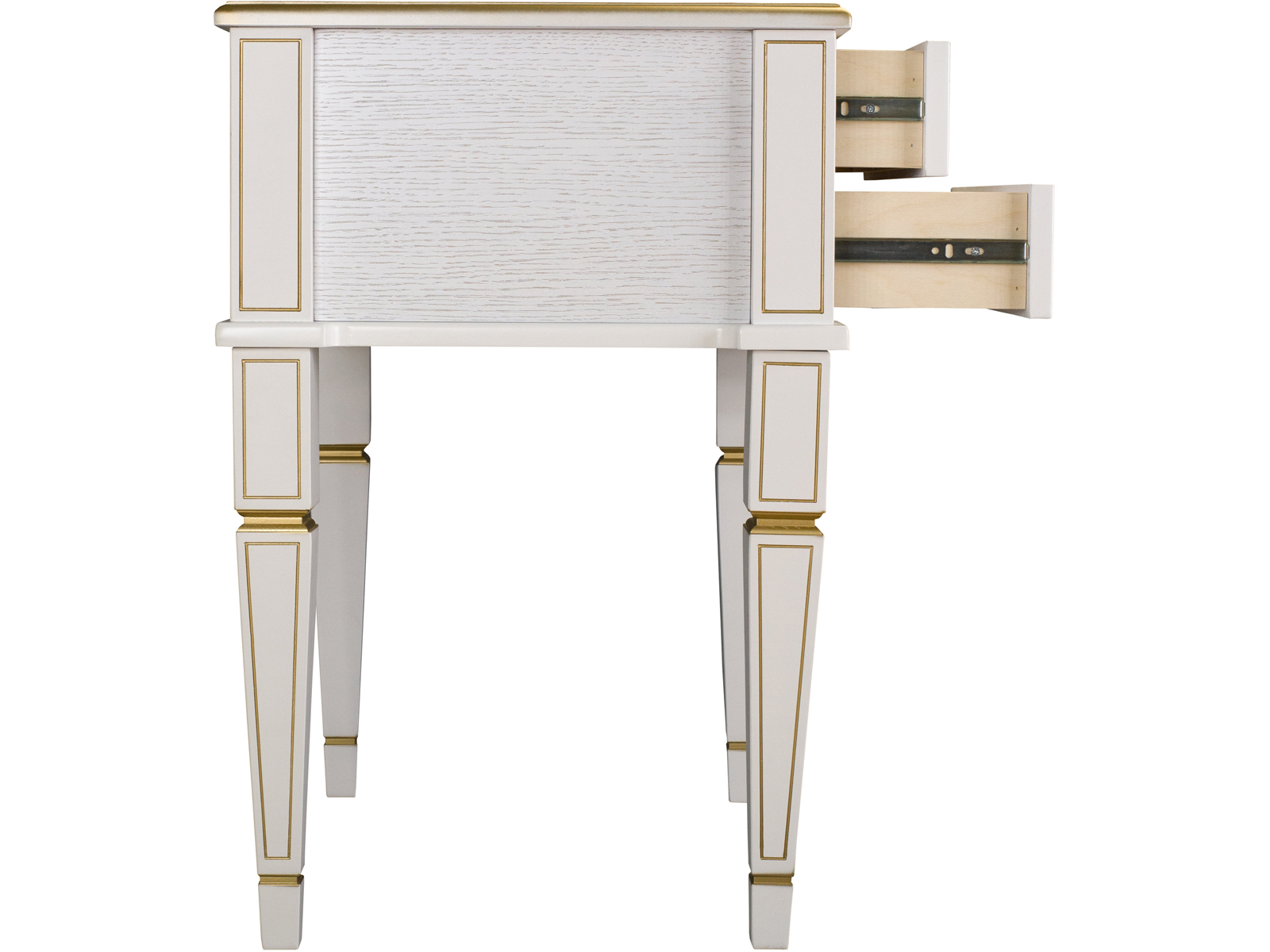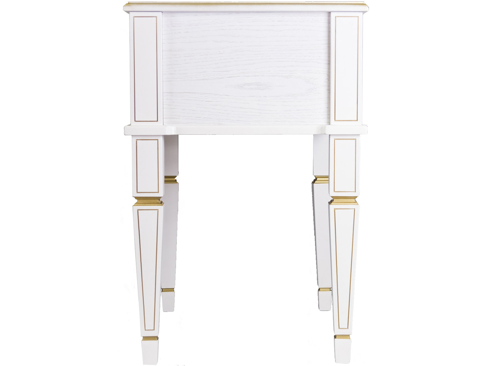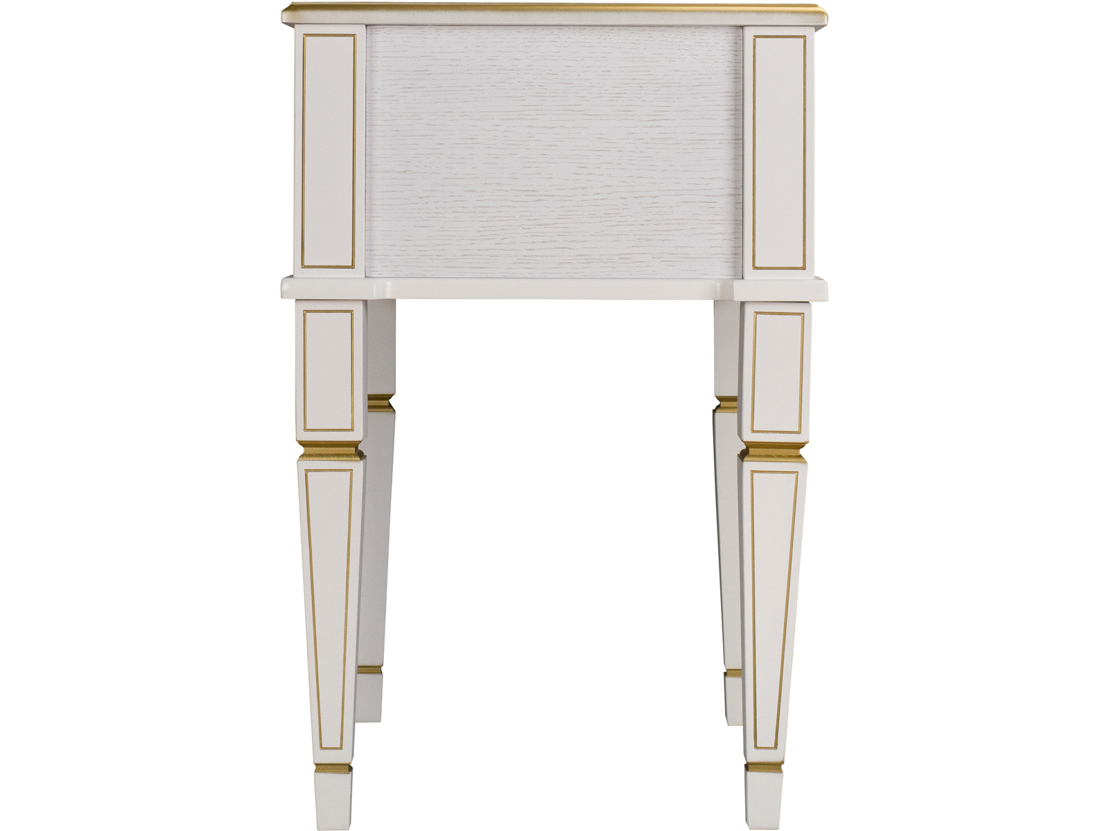 Прикроватная тумба Васко 118 – классическая прикроватная тумба из коллекции предметов интерьера Васко. Коллекцию объединяют изящно нанесенные гравировки на опоры и фасады ящиков и конусообразные ножки. Гравировки подчеркивают элегантные утонченные формы деталей предметов интерьера. Тонкие линии к тому же патинированы, что дополнительно выделяет их на изделиях. Фасады ящиков и поверхность тумбы декорированы натуральным шпоном дуба. Этот материал обладает выдающимся эстетическим свойством – текстура дерева проявляется даже под покрывными отделочными материалами. При этом не теряется ощущение теплоты от соприкосновения с натуральным деревом.