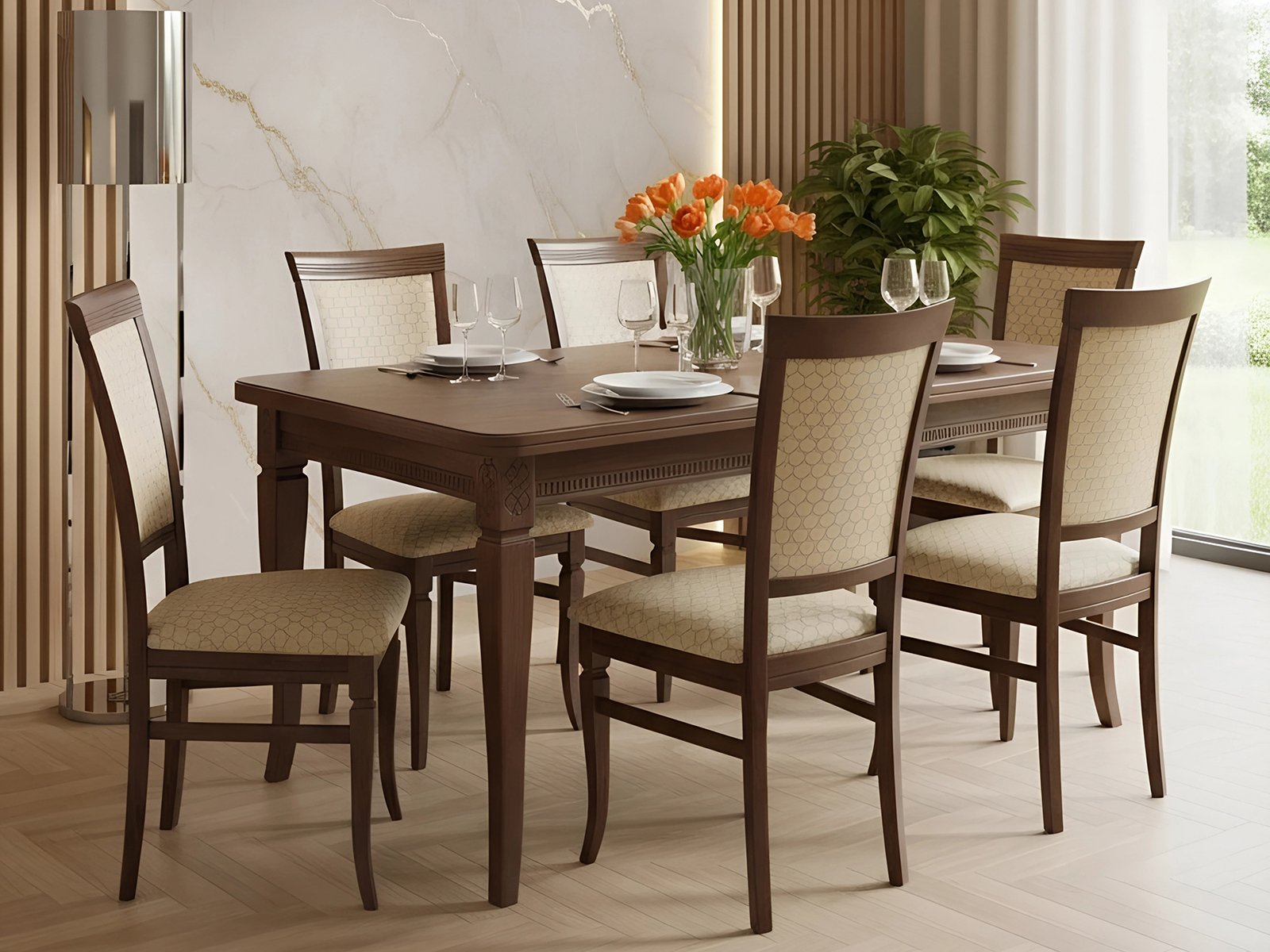 Стол обеденный раздвижной Фидея 3 классической формы, сочетание натуральных материалов, и стильной отделки создаёт благородный и праздничный вид. Ножки изготовлены из массива бука – пожалуй, самой твердой породы дерева из тех, что принято использовать при производстве мебели в нашей стране. Столешницы выполнены из мдф покрытого шпоном натурального ясеня. Ясень – это дерево, отличающееся кроме прочности, одним из самых красивых рисунков текстуры.