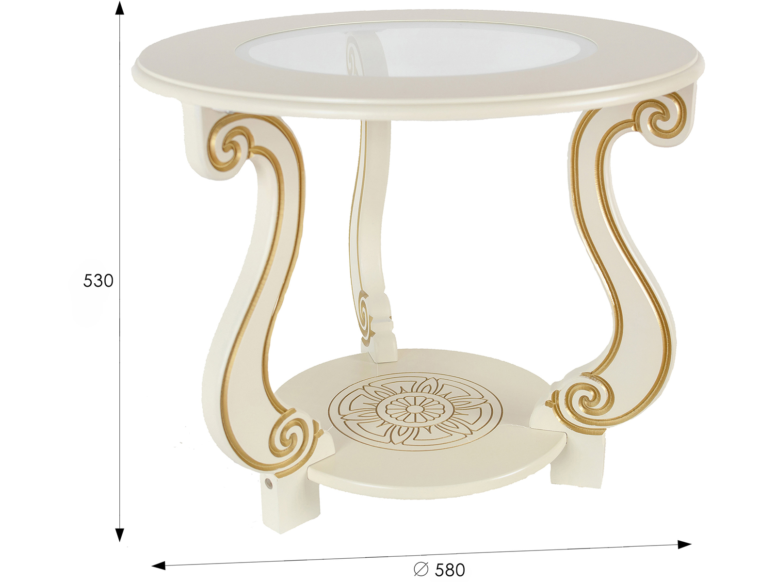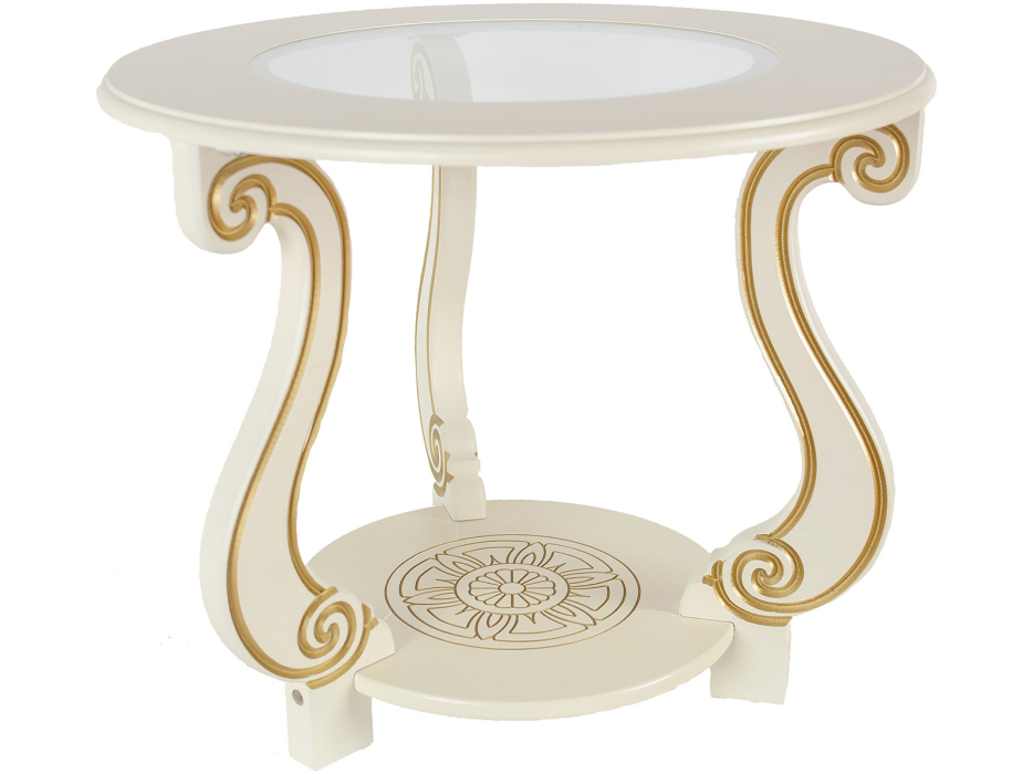 Классический столик в гостиную или спальню со стеклом. Форма стекла перекликается с формой полочки, изящные ножки с резьбой. Оригинальная гравировка на вместительной полке, надежная конструкция. Окрашен в нежный цвет слоновой кости, идеально подходит в светлую спальню. Надежно упакован в одну коробку, легко собирается.