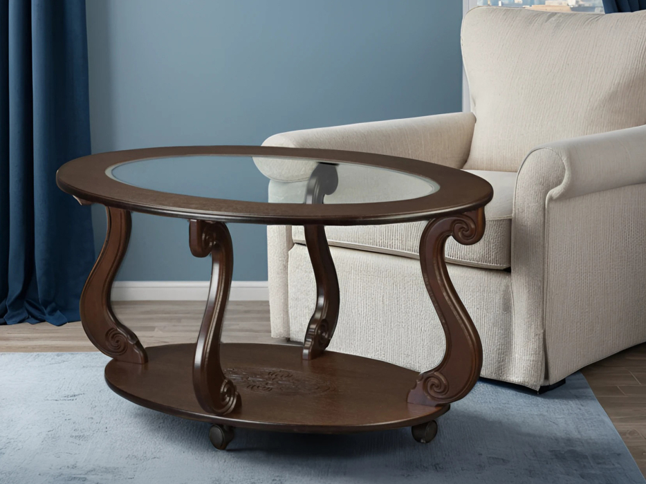 Классический журнальный стол украшен художественной гравировкой на столешнице, полке, ножках. Несколько цветов отделки на выбор, патинирование по резьбе и кромкам для придания изысканности.
