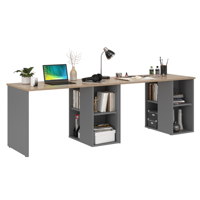Два стола позволяют эффективно распределить материалы, технику и аксессуары, поддерживая порядок и повышая продуктивность. Каждый стол оснащён широкой столешницей 120х65 см и тумбой с открытыми полками, где удобно хранить книги, тетради, канцелярские принадлежности и повседневные аксессуары. Функциональная конструкция обеспечивает комфорт при работе за ноутбуком, выполнении домашних заданий или занятиях творчеством. Универсальная сборка столов позволяет устанавливать тумбу справа или слева, адаптируя стол под планировку помещения.