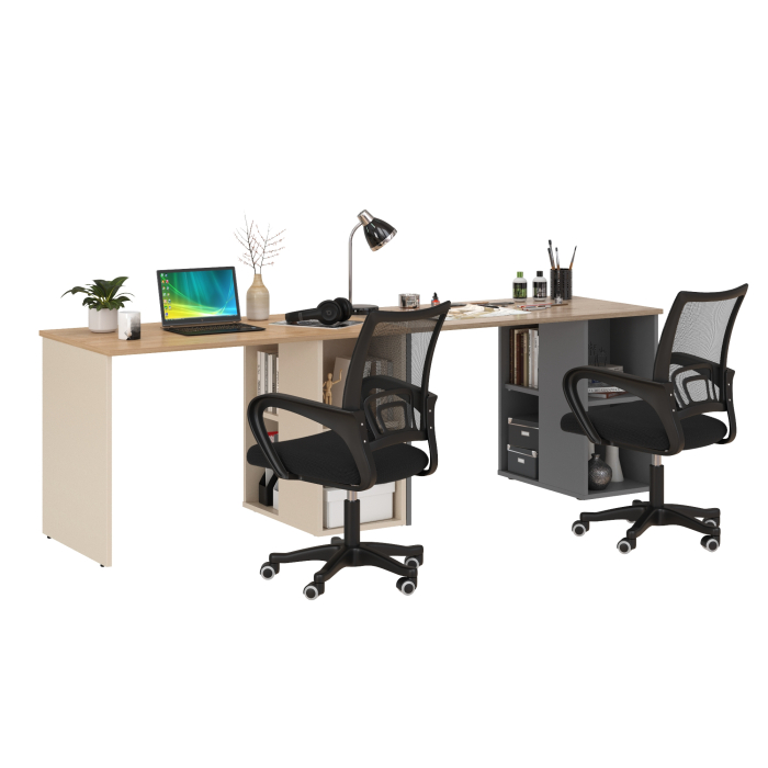 Два письменных стола Лайт 12.163 и два чёрных компьютерных кресла — это практичное решение для современной детской или рабочего кабинета. Такое сочетание обеспечивает двум пользователям полноценные индивидуальные зоны, где каждому хватает пространства для учёбы, творчества и работы за компьютером.