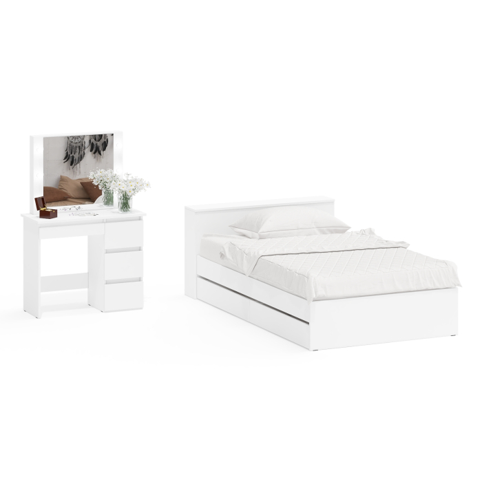 Кровать с ящиками полутораспальная Ксения 1200 и туалетный столик с подсветкой Сура. Комплектация состоит из односпальной кровати с выдвижными ящиками и туалетного столика с подсветкой.