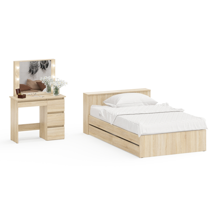 Кровать с ящиками полутораспальная Ксения 1200 и туалетный столик с подсветкой Сура. Комплектация состоит из односпальной кровати с выдвижными ящиками и туалетного столика с подсветкой.