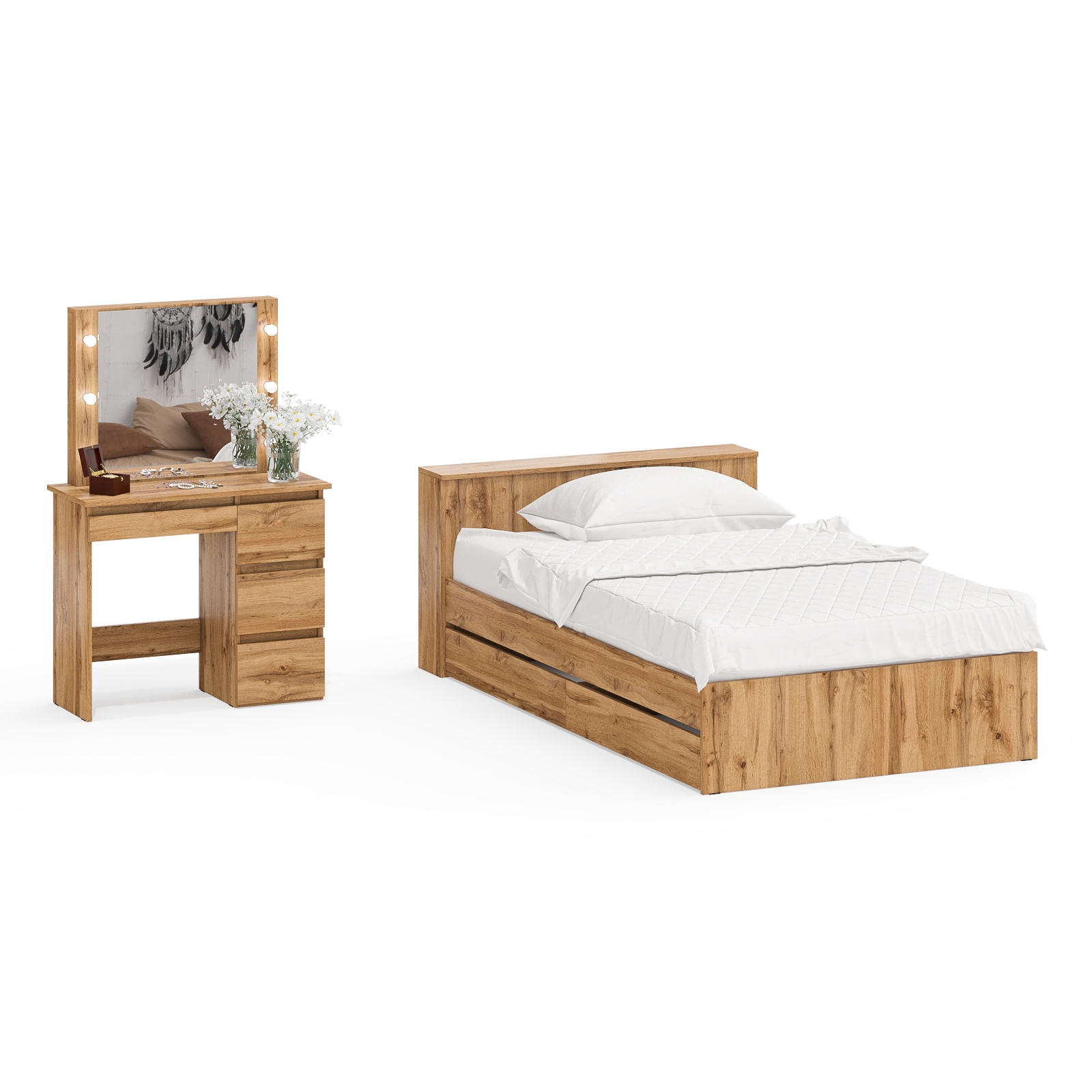 Кровать с ящиками полутораспальная Ксения 1200 и туалетный столик с подсветкой Сура. Комплектация состоит из односпальной кровати с выдвижными ящиками и туалетного столика с подсветкой.