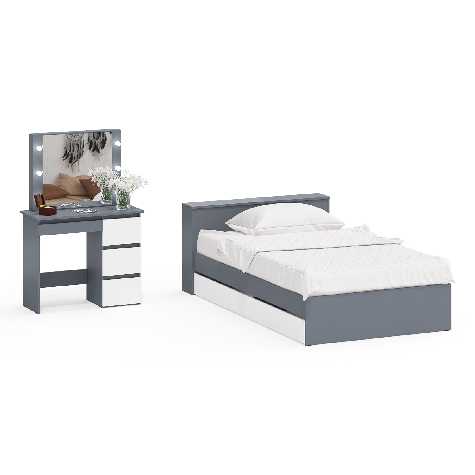 Кровать с ящиками полутораспальная Ксения 1200 и туалетный столик с подсветкой Сура. Комплектация состоит из односпальной кровати с выдвижными ящиками и туалетного столика с подсветкой.