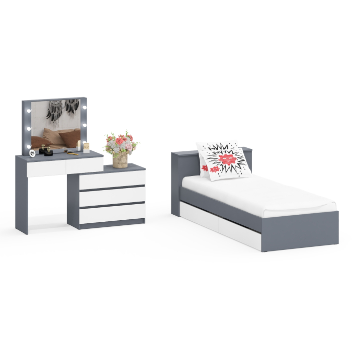 Комплектация состоит из кровати с выдвижными ящиками и косметического стола с подсветкой. Кровать имеет односпальное место 900х2000 мм с прочным основанием в комплекте. Матрас приобретается отдельно. В основании кровати два ящика на роликовых направляющих, которые обеспечивают легкое выдвижение. В изголовье предусмотрена ниша с откидной дверкой, которая отлично подойдет для хранения. Кровать имеет универсальную сборку, что позволяет расположить выдвижные ящики как с левой, так и с правой стороны. Фасады ящиков выполнены без ручек – удобные выемки обеспечивают простоту использования.