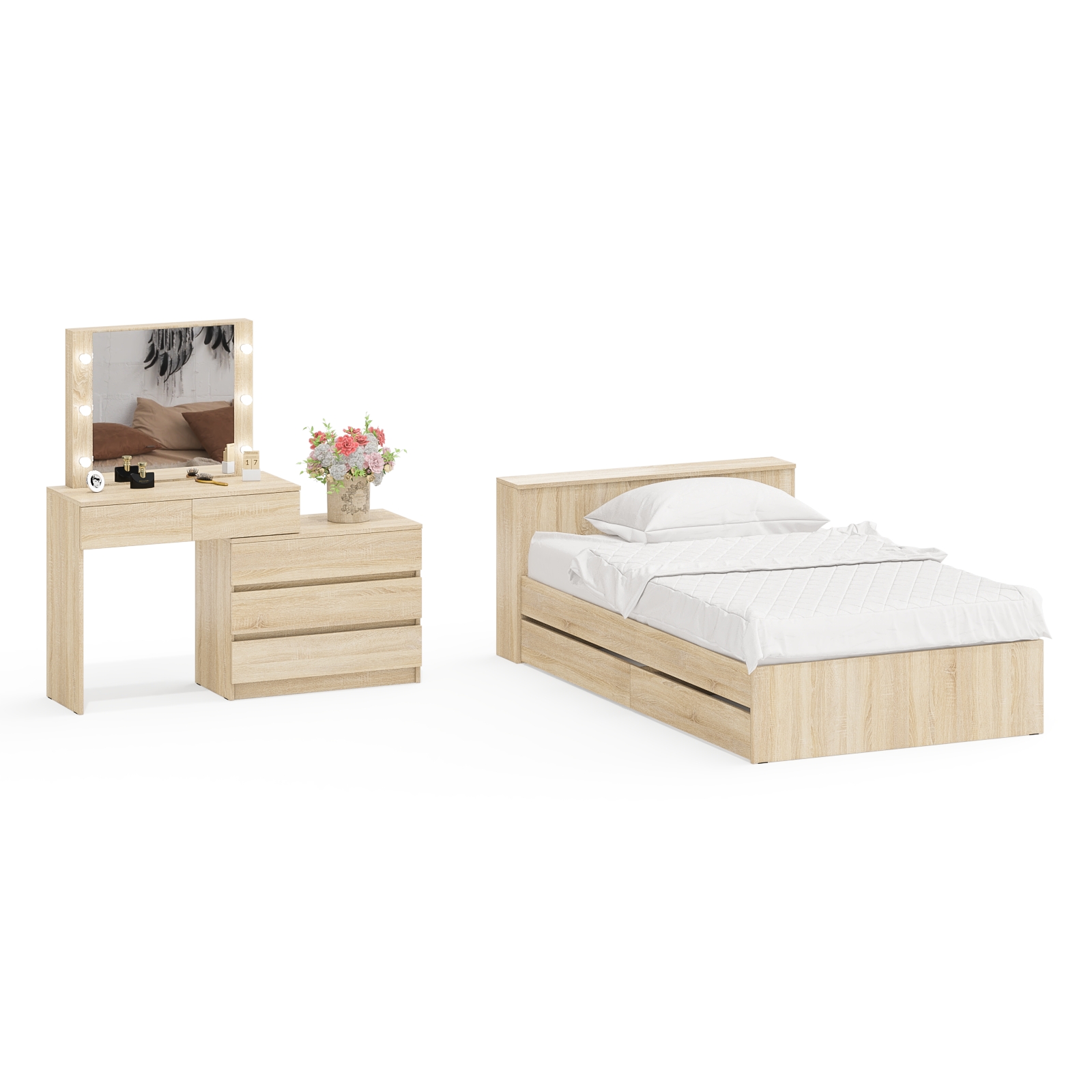 Столик туалетный с лампочками 110 с полутораспальной кроватью с ящиками Ксения 1200. Комплект подойдёт как для детской комнаты, так и для небольшой спальни, обеспечивая комфортное использование. Комплектация состоит из односпальной кровати с выдвижными ящиками и туалетного столика с лампочками.