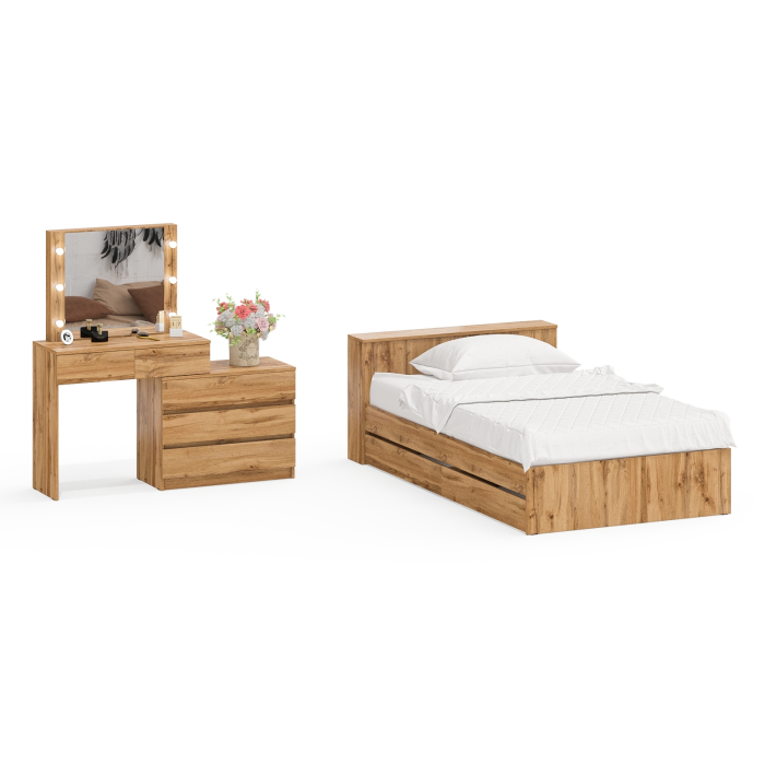 Столик туалетный с лампочками 110 с полутораспальной кроватью с ящиками Ксения 1200. Комплект подойдёт как для детской комнаты, так и для небольшой спальни, обеспечивая комфортное использование. Комплектация состоит из односпальной кровати с выдвижными ящиками и туалетного столика с лампочками.