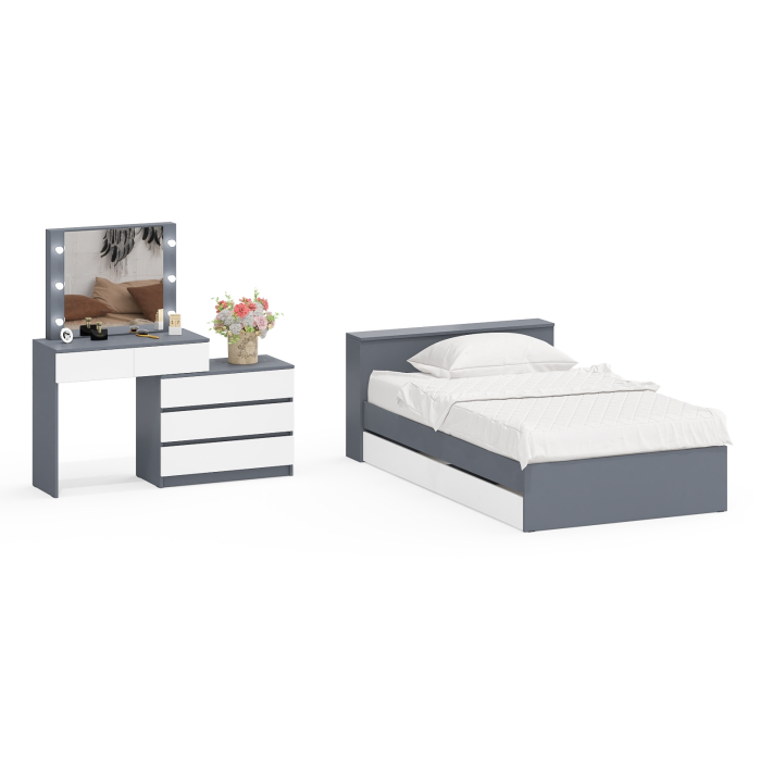 Столик туалетный с лампочками 110 с полутораспальной кроватью с ящиками Ксения 1200. Комплект подойдёт как для детской комнаты, так и для небольшой спальни, обеспечивая комфортное использование. Комплектация состоит из односпальной кровати с выдвижными ящиками и туалетного столика с лампочками.