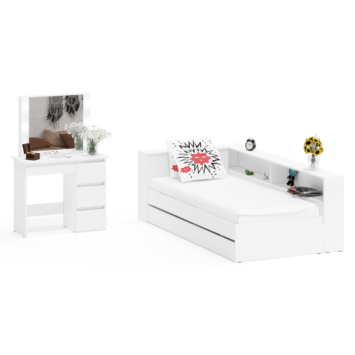 Кровать с ящиками с прикроватным блоком для вещей Ксения 900 и столик косметический с подсветкой Сура. Комплектация состоит из кровати с выдвижными ящиками, прикроватного блока для хранения вещей и косметического столика с подсветкой.