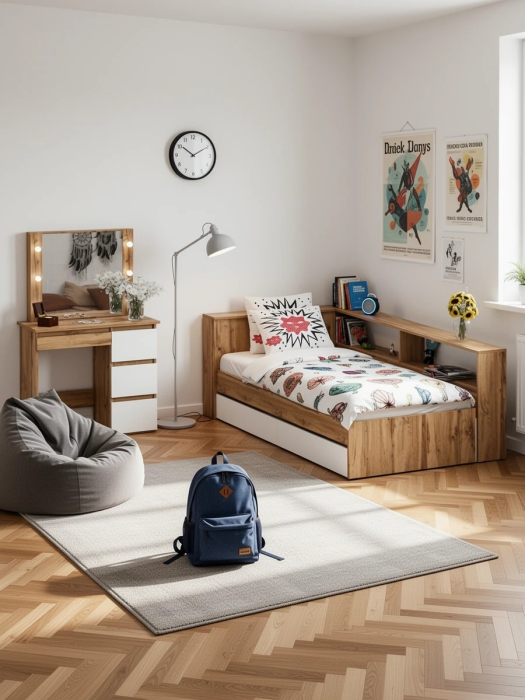 Кровать с ящиками с прикроватным блоком для вещей Ксения 900 и столик косметический с подсветкой Сура. Комплектация состоит из кровати с выдвижными ящиками, прикроватного блока для хранения вещей и косметического столика с подсветкой.