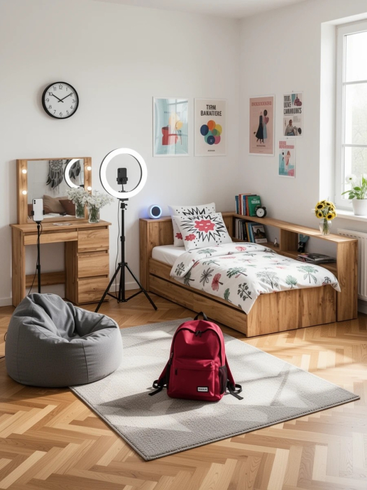 Кровать с ящиками с прикроватным блоком для вещей Ксения 900 и столик косметический с подсветкой Сура. Комплектация состоит из кровати с выдвижными ящиками, прикроватного блока для хранения вещей и косметического столика с подсветкой.