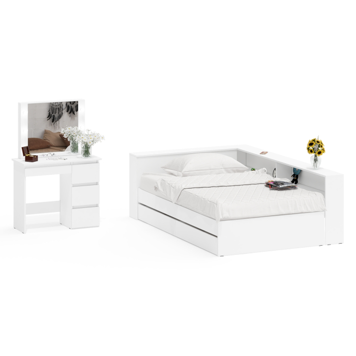 Кровать с прикроватным блоком с ящиками Ксения 1200 и туалетный столик с подсветкой Сура. Комплектация состоит из кровати с выдвижными ящиками, прикроватного блока и туалетного столика с подсветкой.