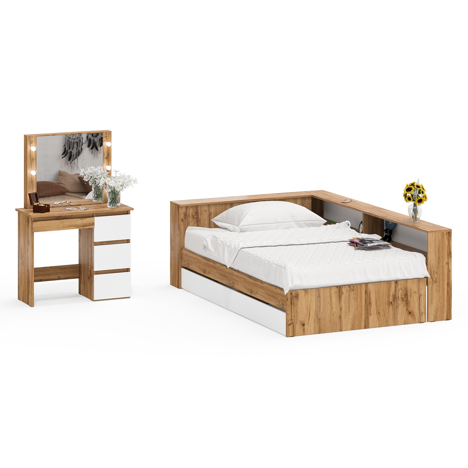 Отзывы о Столплит Кровать с прикроватным блоком с ящиками Ксения 1200 и туалетный столик с подсветкой Сура Белый/Дуб вотан