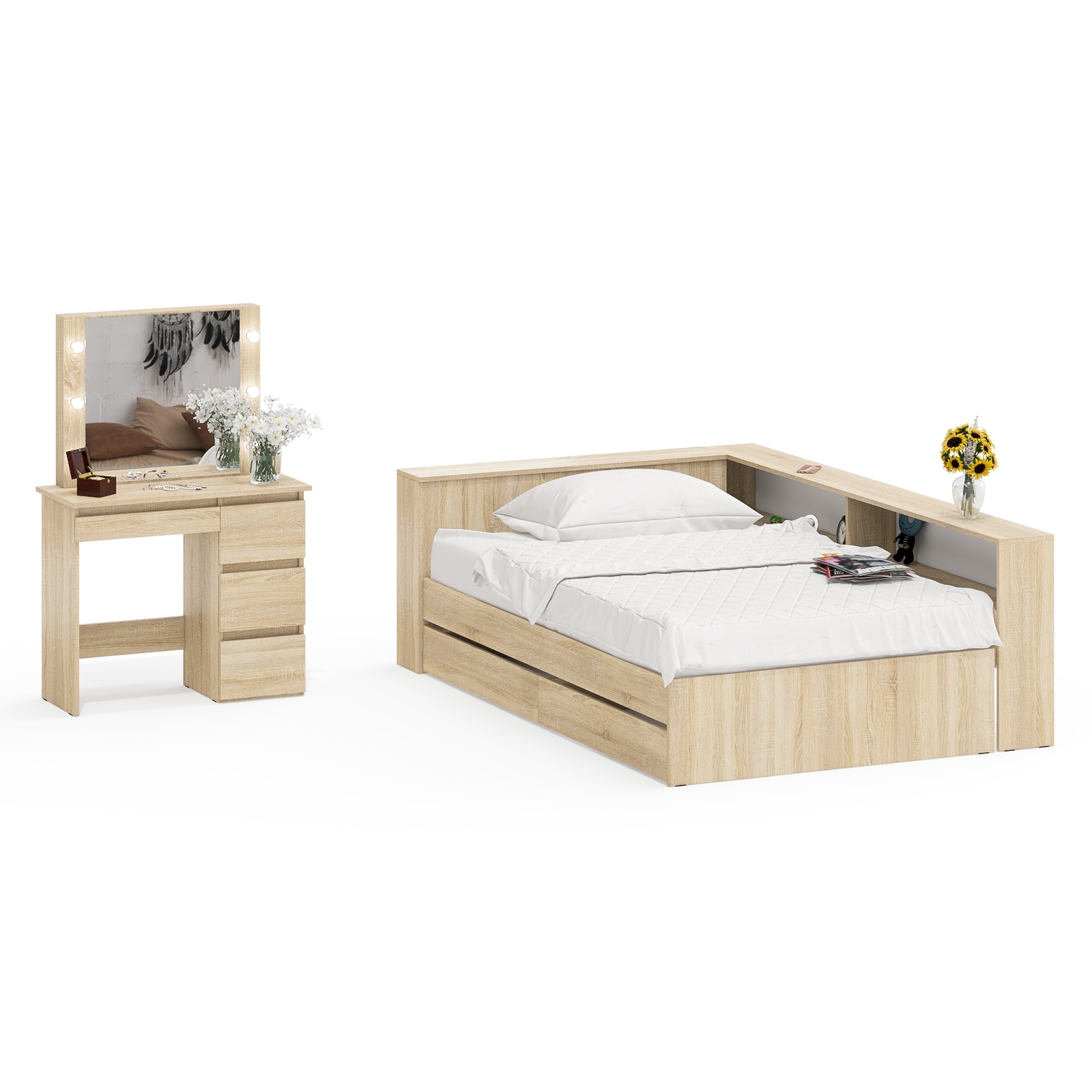 Отзывы о Столплит Кровать с прикроватным блоком с ящиками Ксения 1200 и туалетный столик с подсветкой Сура Дуб сонома