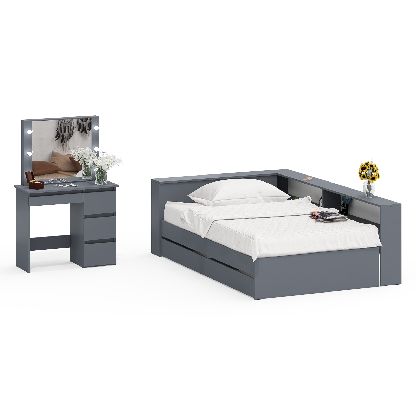 Отзывы о Столплит Кровать с прикроватным блоком с ящиками Ксения 1200 и туалетный столик с подсветкой Сура Графит